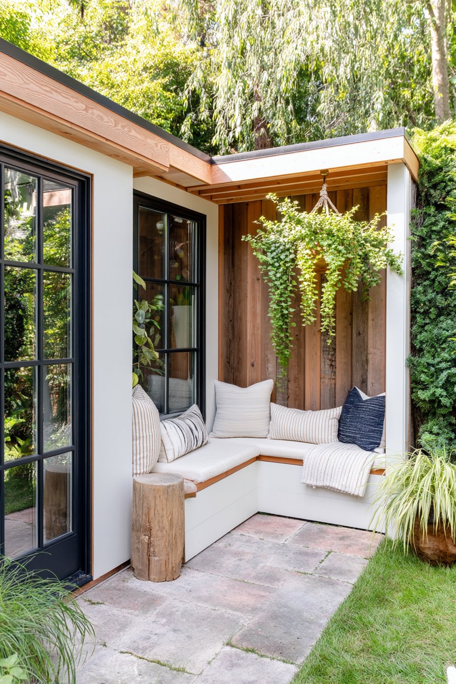 This design beautifully blends cozy seating with lush ferns, creating a serene retreat perfect for relaxation. To replicate this look, incorporate comfortable cushions and hanging plants to enhance the inviting atmosphere.
