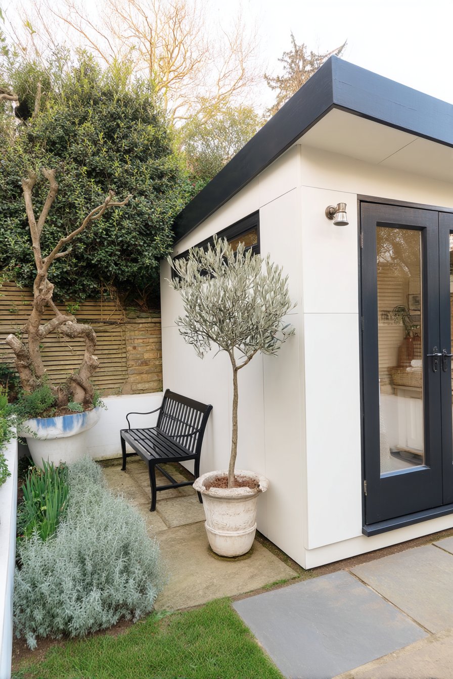 The sleek, minimalist shed contrasts beautifully with lush greenery, featuring potted olive trees and vibrant foliage that invite tranquility. To replicate this serene look, incorporate native plants and a simple stone pathway to enhance your garden’s modern appeal.