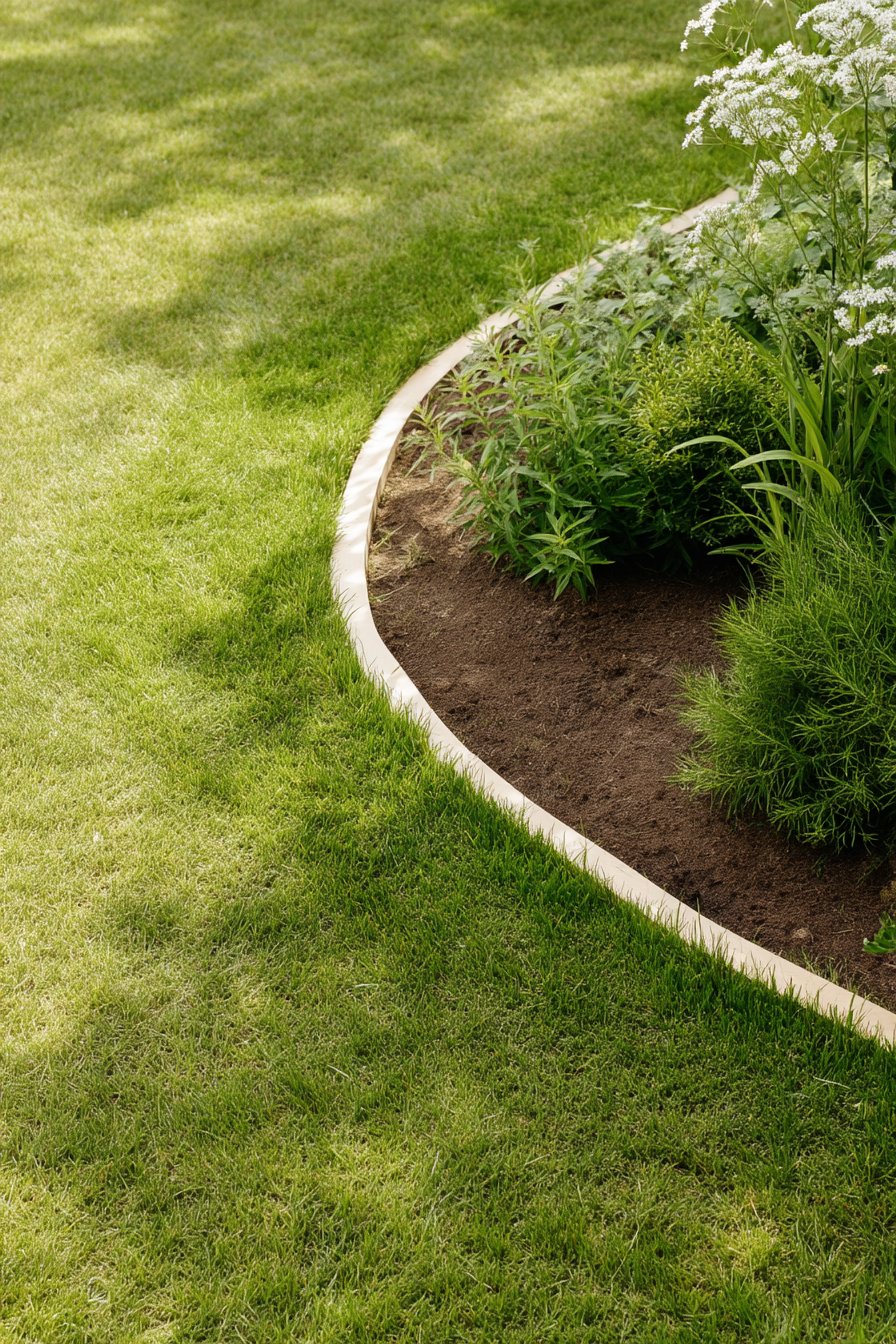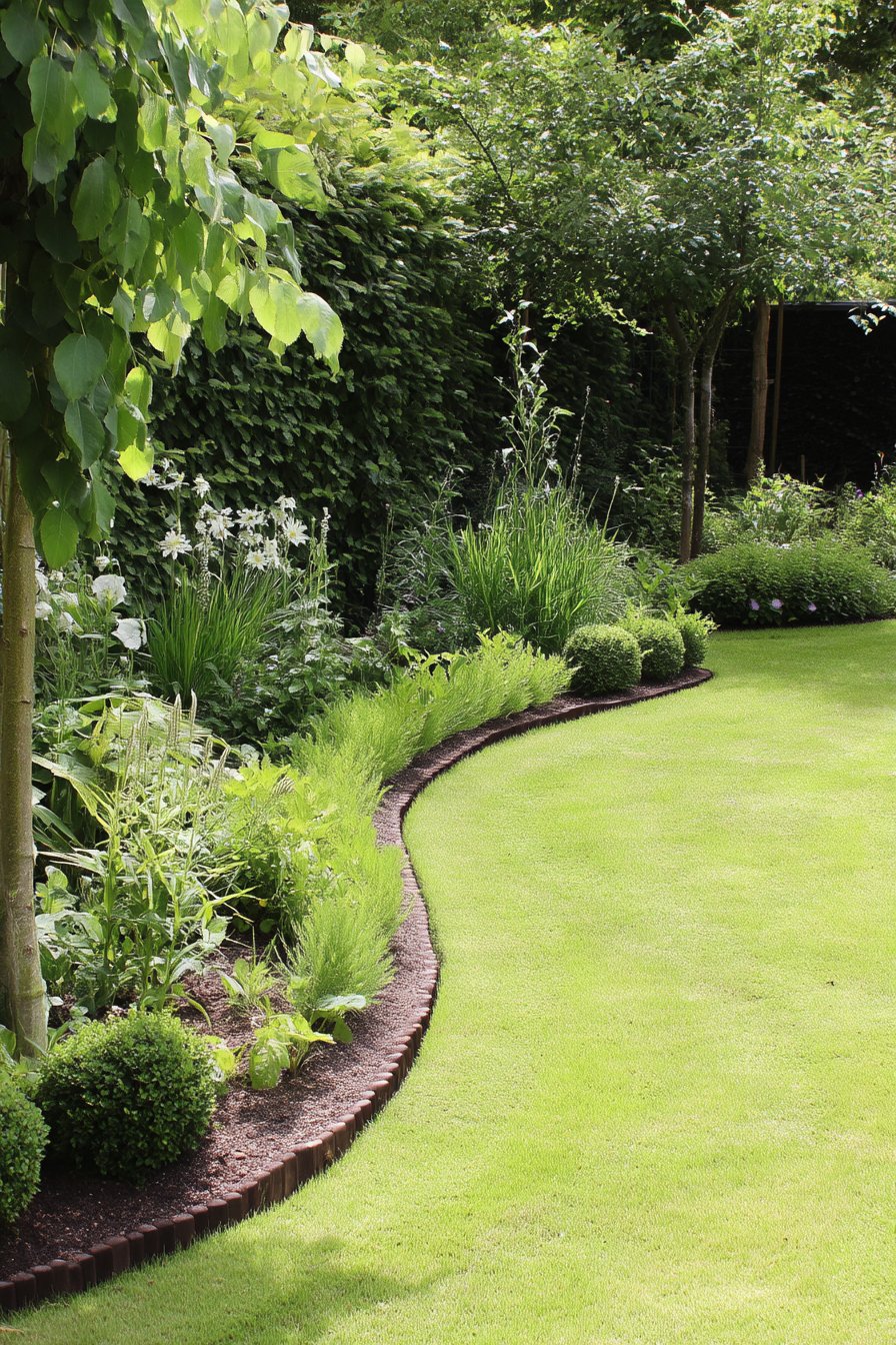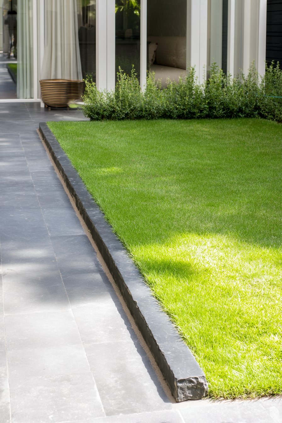 The sleek stone edging beautifully contrasts with the vibrant green lawn, creating a modern, polished look that enhances any garden space. Incorporate low-maintenance plants like boxwoods and lavender alongside the edging for added texture and fragrance.