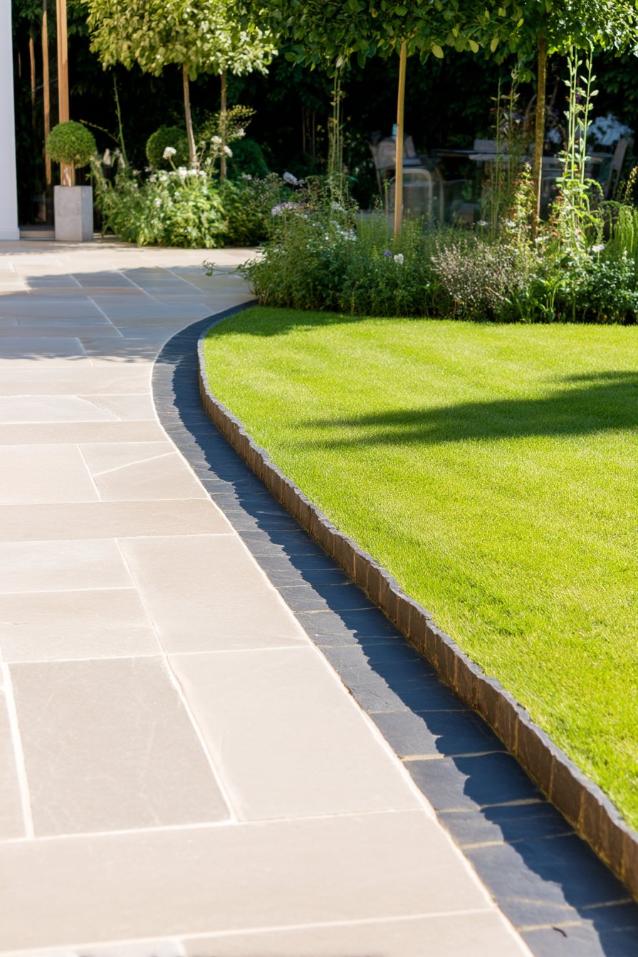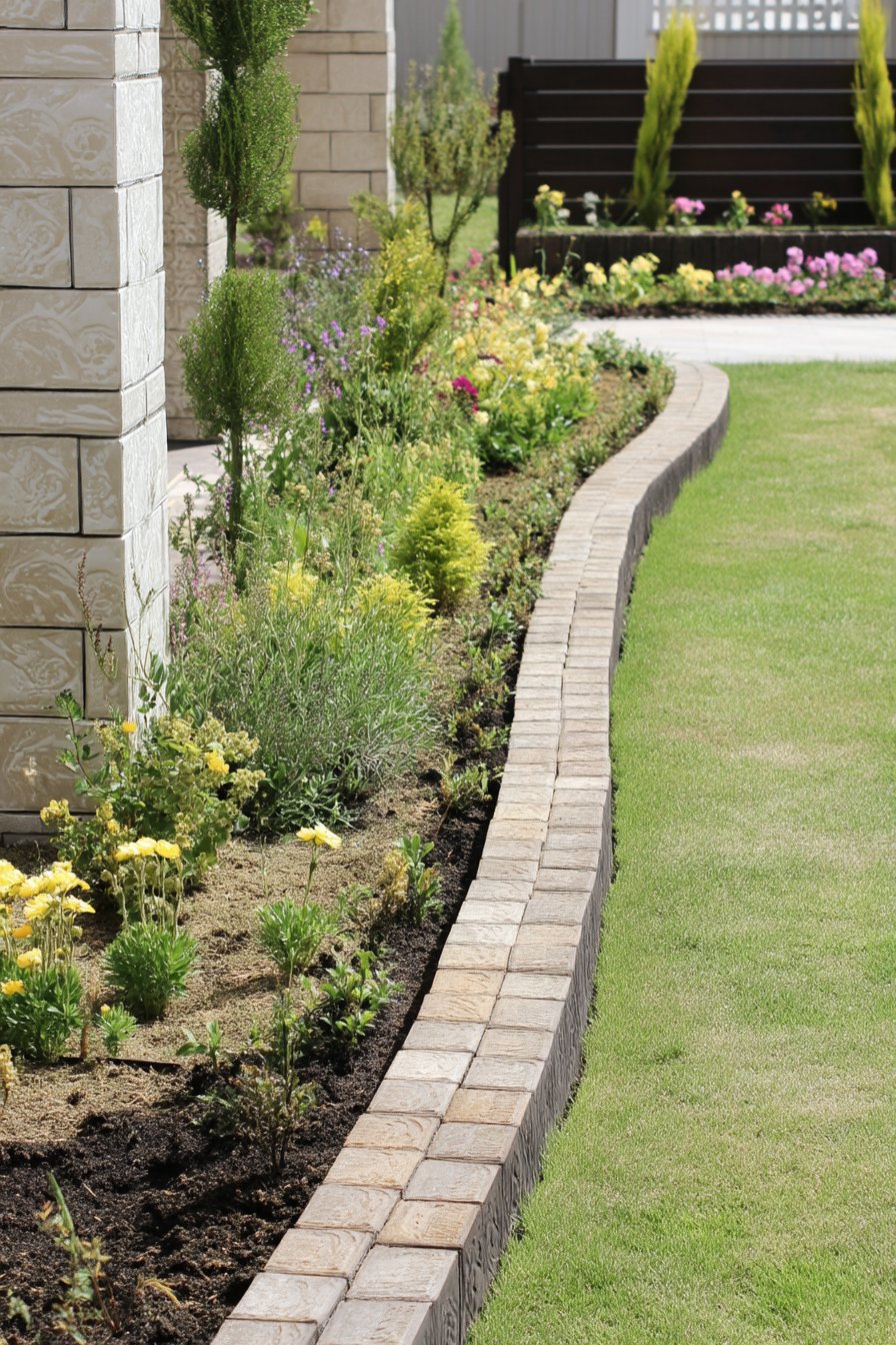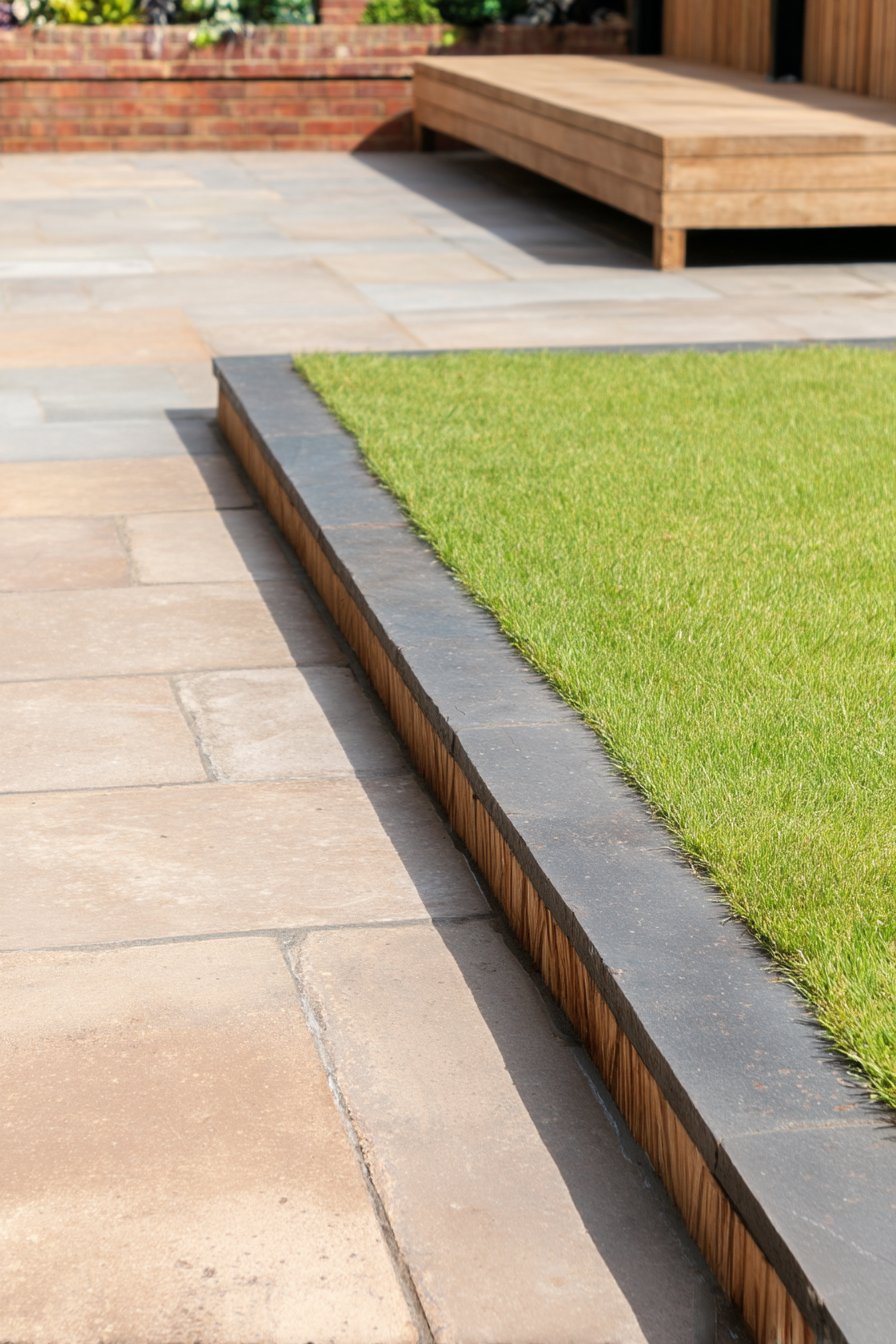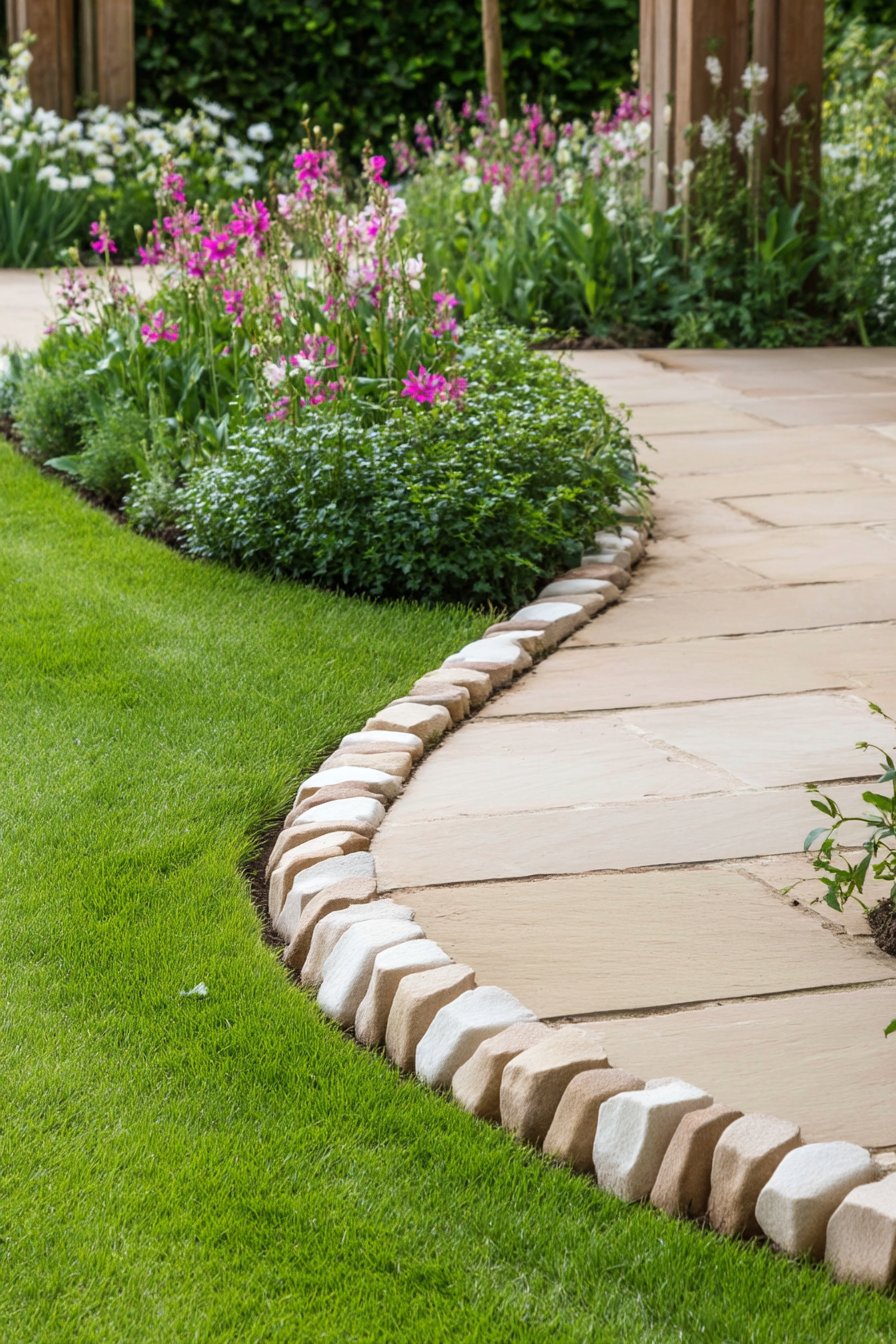 The sleek stone edging beautifully contrasts with the vibrant green lawn, creating a modern, polished look that enhances any garden space. Incorporate low-maintenance plants like boxwoods and lavender alongside the edging for added texture and fragrance.