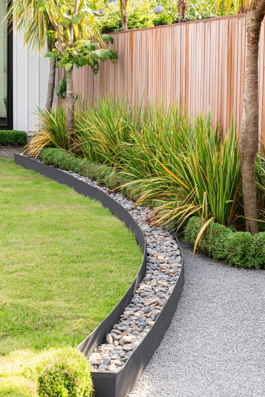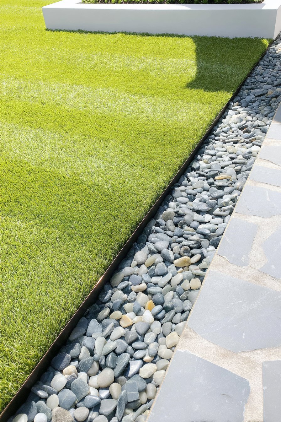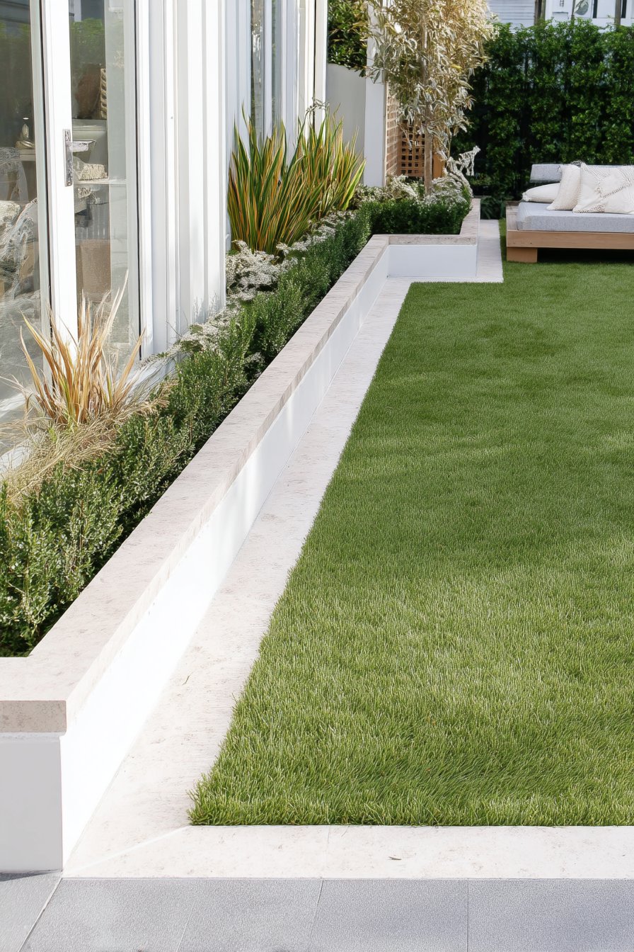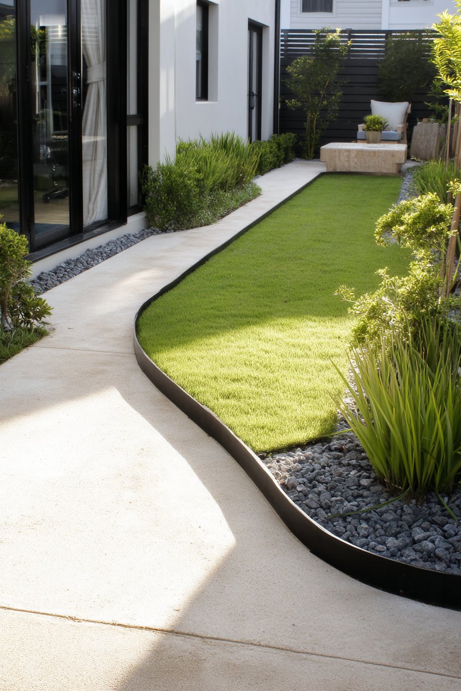 The sleek stone edging beautifully contrasts the vibrant green grass, creating a modern and clean look. To replicate this design, consider using low-maintenance native grasses alongside attractive stone borders for a polished finish.