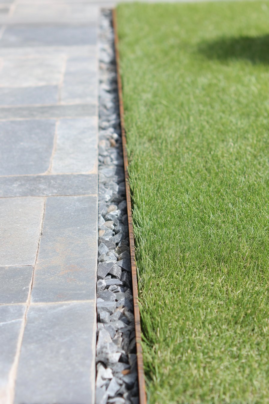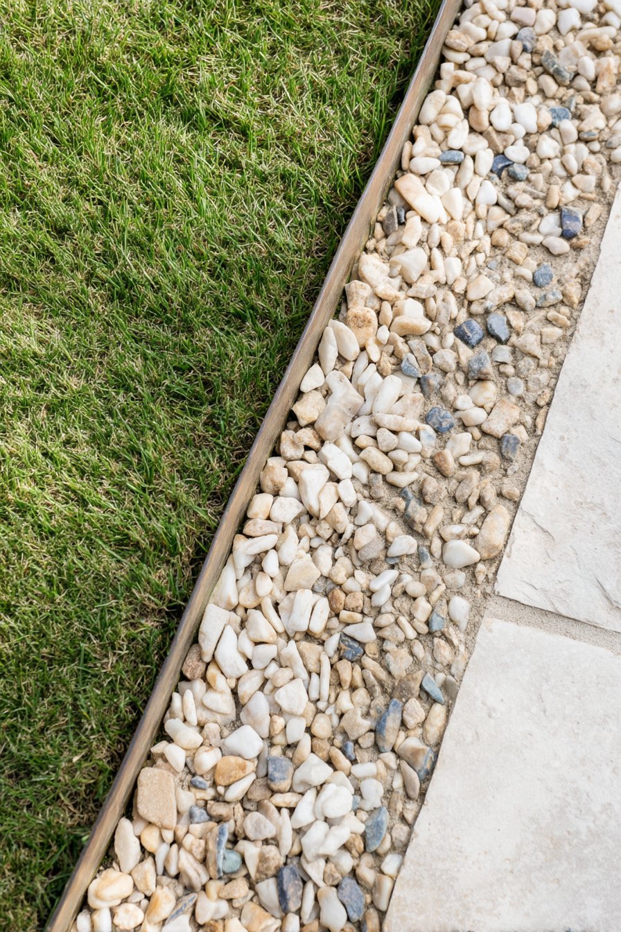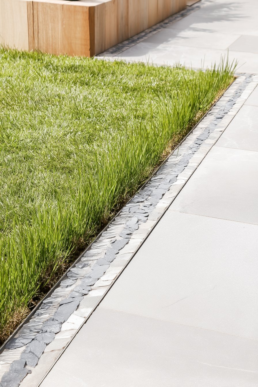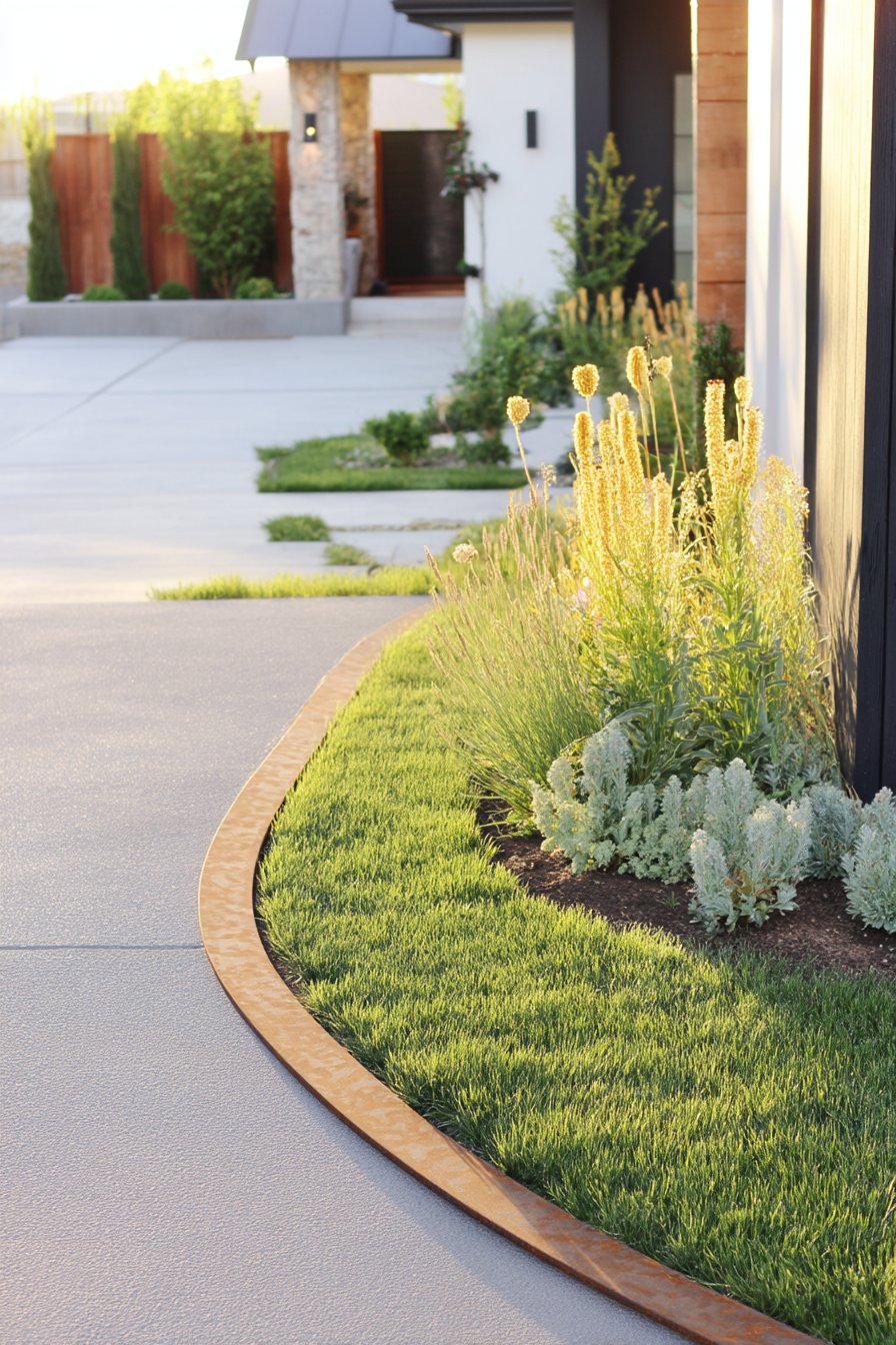 The sleek stone edging beautifully contrasts the vibrant green grass, creating a modern and clean look. To replicate this design, consider using low-maintenance native grasses alongside attractive stone borders for a polished finish.