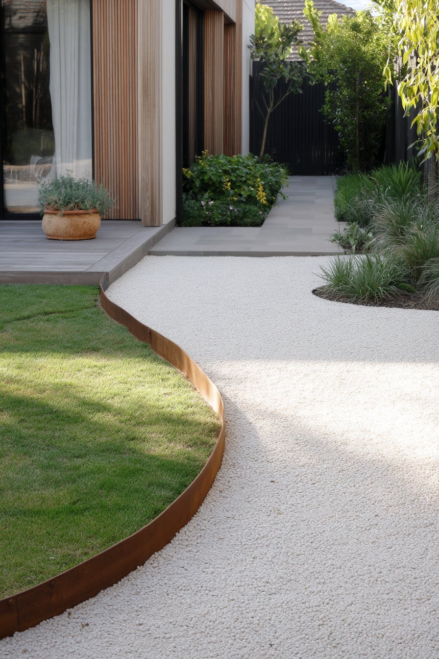 The harmonious blend of curved metal edging and a gravel pathway creates a modern, inviting atmosphere, ideal for contemporary gardens. Incorporating low-maintenance plants like ornamental grasses and strategically placed pots can enhance the aesthetic while ensuring easy upkeep.