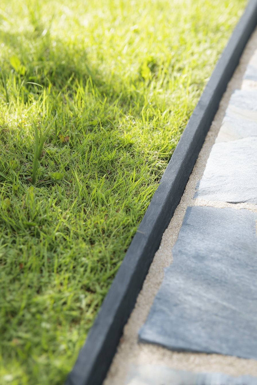 The sleek black stone edging beautifully contrasts with the vibrant green lawn, creating a modern yet inviting atmosphere. To replicate this look, consider using low-maintenance grasses alongside structured borders for a clean, contemporary finish.