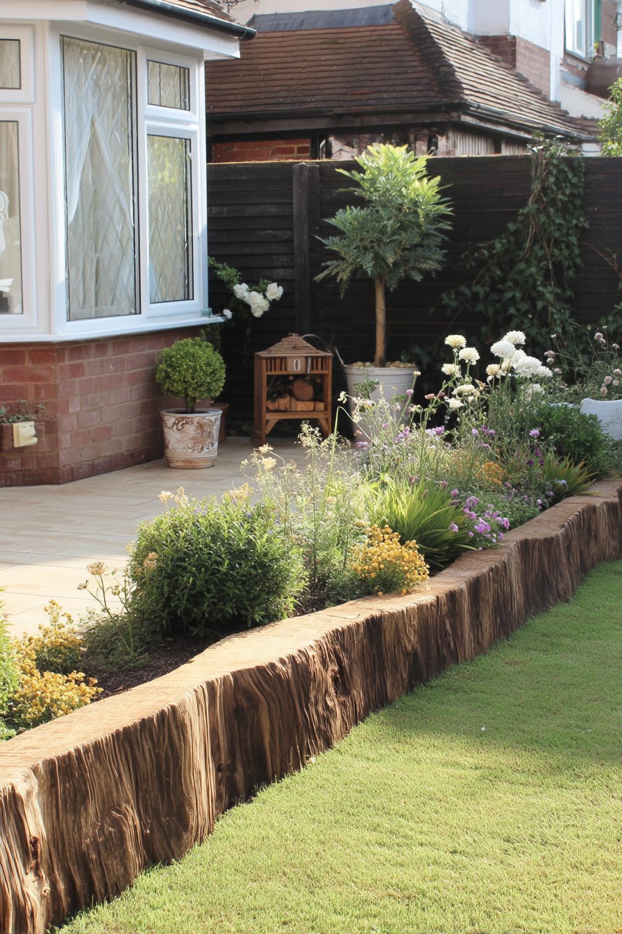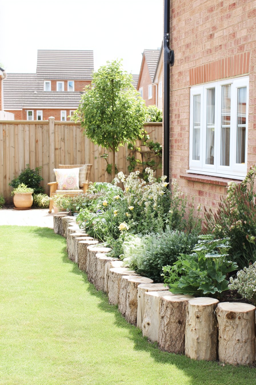 The charming log edging beautifully contrasts with the lush greenery of plants like lavender and daisies, creating a serene, rustic atmosphere. To replicate this look, use natural wood for borders and choose a mix of perennials for year-round color and texture.