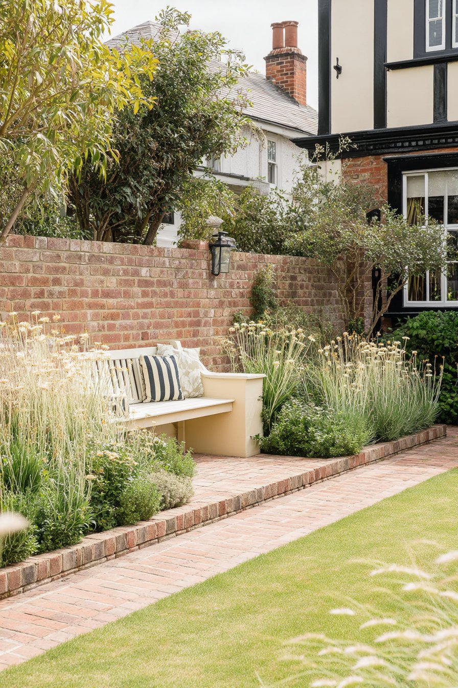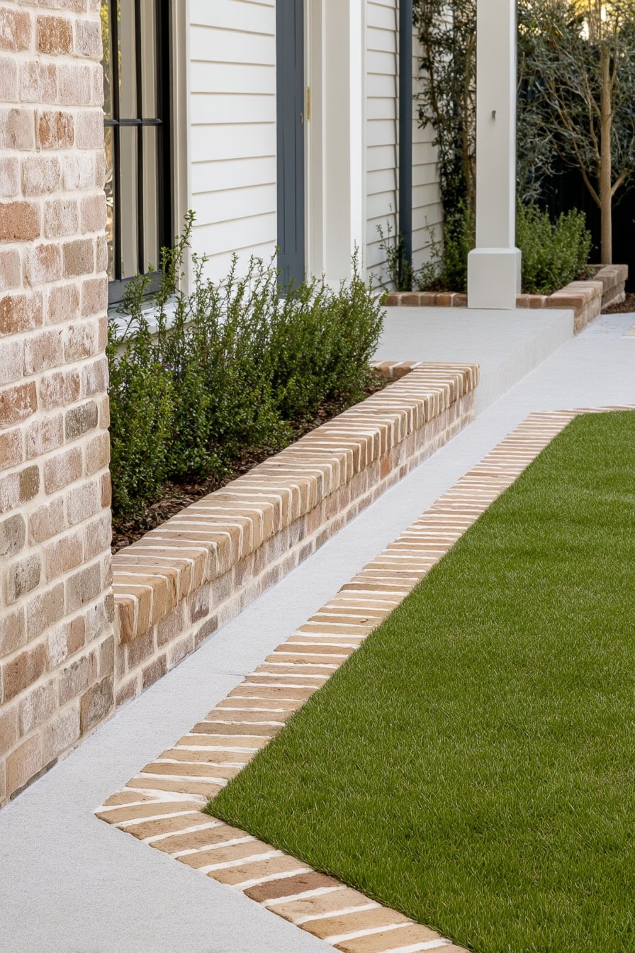 The warm tones of the brick edging beautifully contrast with the lush green lawn, creating a modern yet inviting atmosphere. To replicate this look, consider using low-maintenance plants like boxwood for structure and choose durable materials for a polished finish.