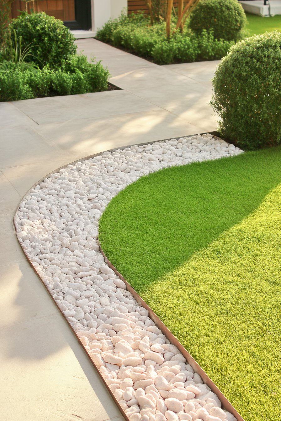 The elegant curved white stone edging beautifully contrasts with the lush green grass, creating a modern, clean aesthetic that invites tranquility. To achieve a similar look, consider using low-maintenance plants like boxwood for structure and decorative stones for a refined border.