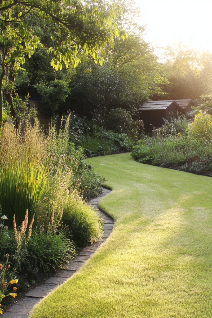 Curved stone edging beautifully defines the lush green grass, creating a soft, inviting pathway that draws the eye through the garden. Incorporate ornamental grasses and perennials like lavender and daylilies for vibrant color and texture, ensuring a harmonious blend with the natural landscape.