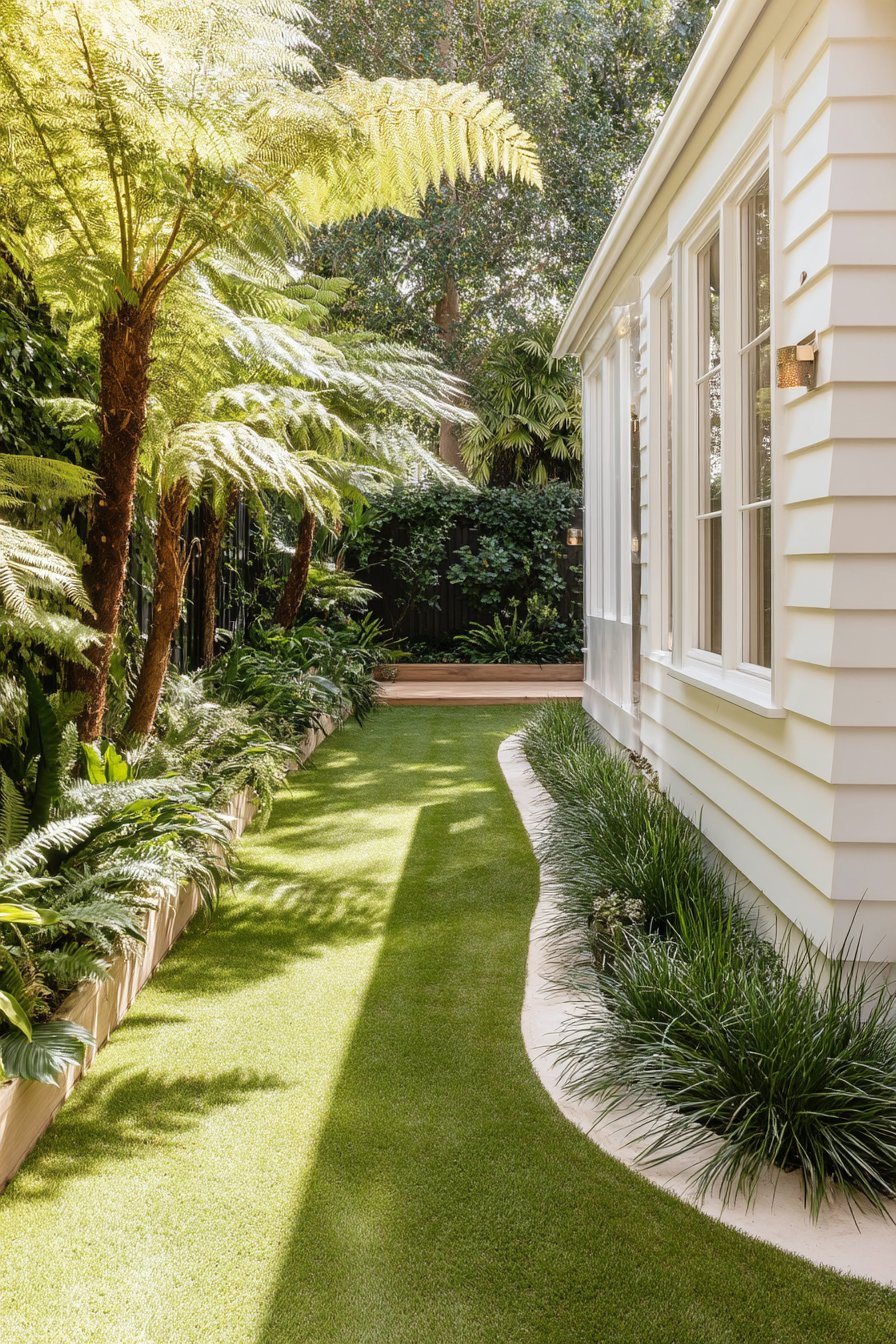 Create a serene pathway framed by lush ferns and vibrant tropical plants, utilizing varied textures for depth. Incorporate low-maintenance ground cover like ornamental grasses to enhance the inviting feel while ensuring easy upkeep.