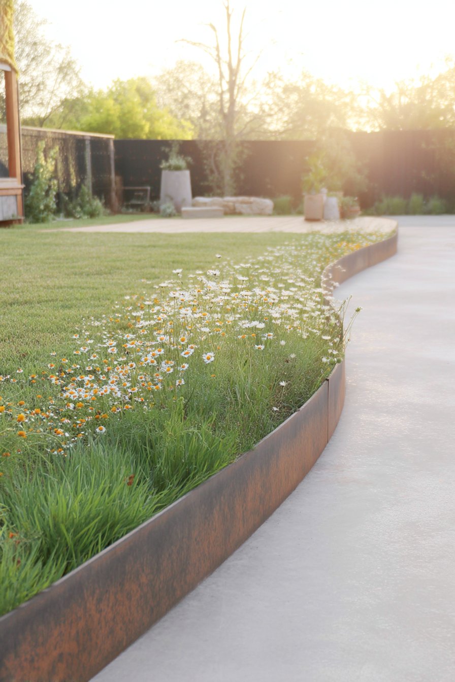 Curved metal edging beautifully delineates vibrant wildflowers like daisies and calendulas, creating a lively yet serene atmosphere. To replicate this look, choose native wildflowers for easy maintenance and a natural aesthetic.
