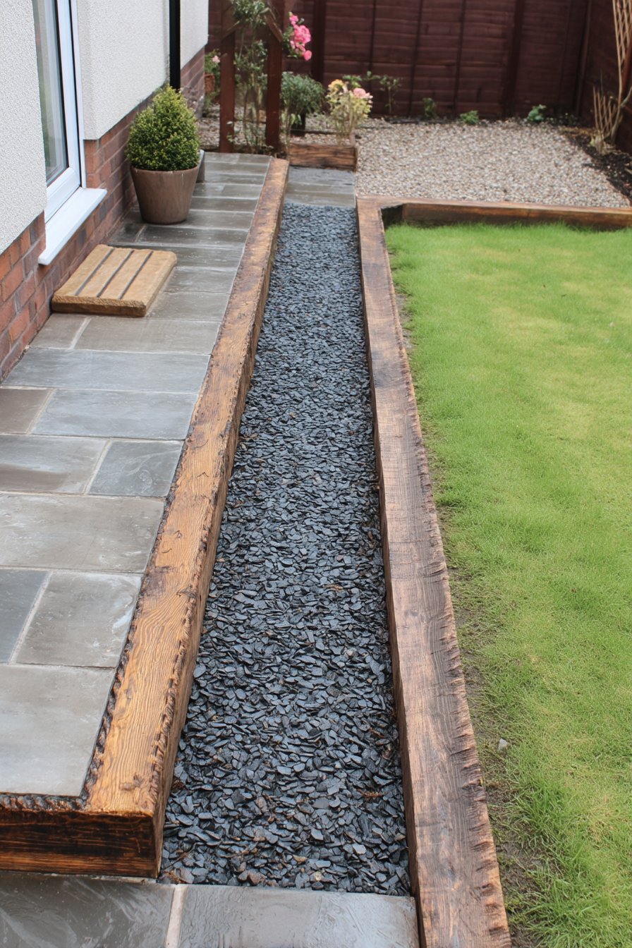 The combination of rustic timber edging and sleek black gravel creates a striking contrast that enhances any garden’s natural beauty. Incorporate low-maintenance plants like boxwoods and drought-resistant perennials to achieve a similar aesthetic while ensuring durability and charm.