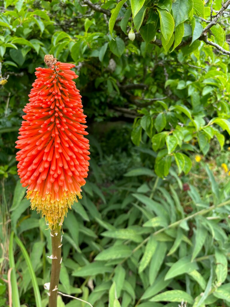 Red Hot Poker is a tall, bright flower with spikes of orange, yellow, and red. Hummingbirds really like these flowers because of their shape and color. The blooms are like long tubes, making it easy for hummingbirds to drink the nectar.