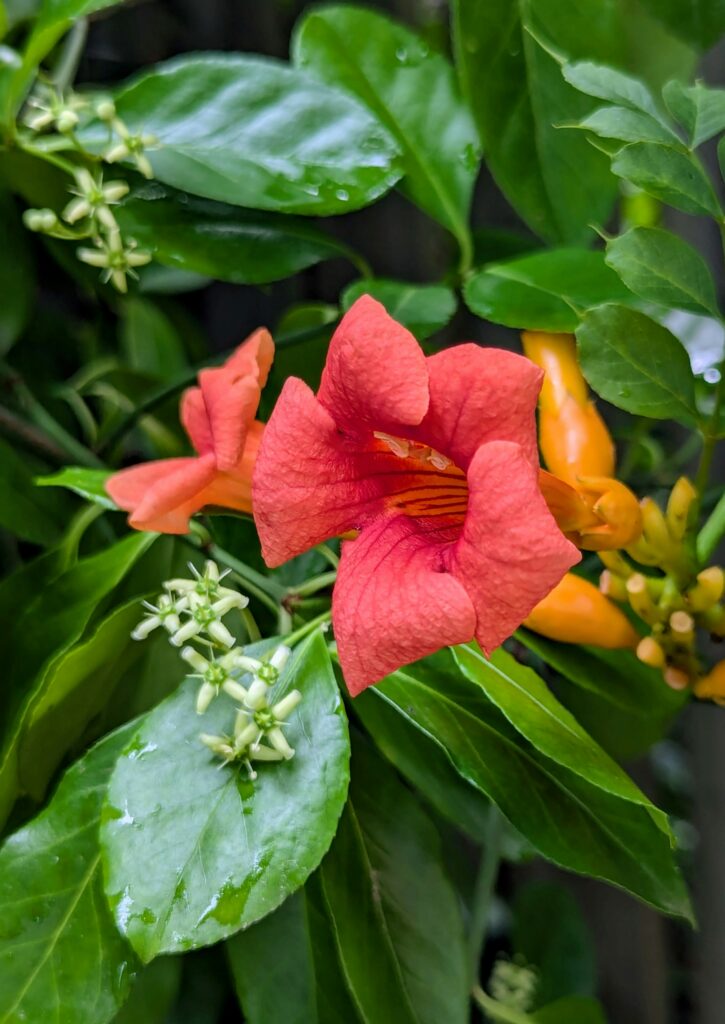 This plant likes plenty of sunshine, but it can handle some shade. You should plant trumpet creeper along fences or trellises since it needs support to climb. Be aware—it can spread quickly, so it’s best to keep an eye on it.