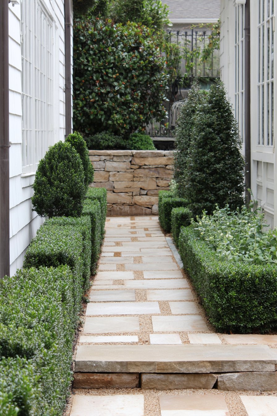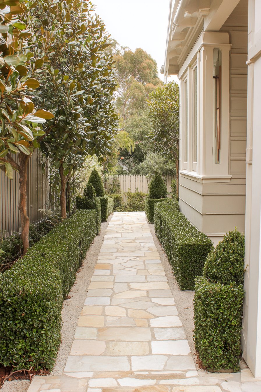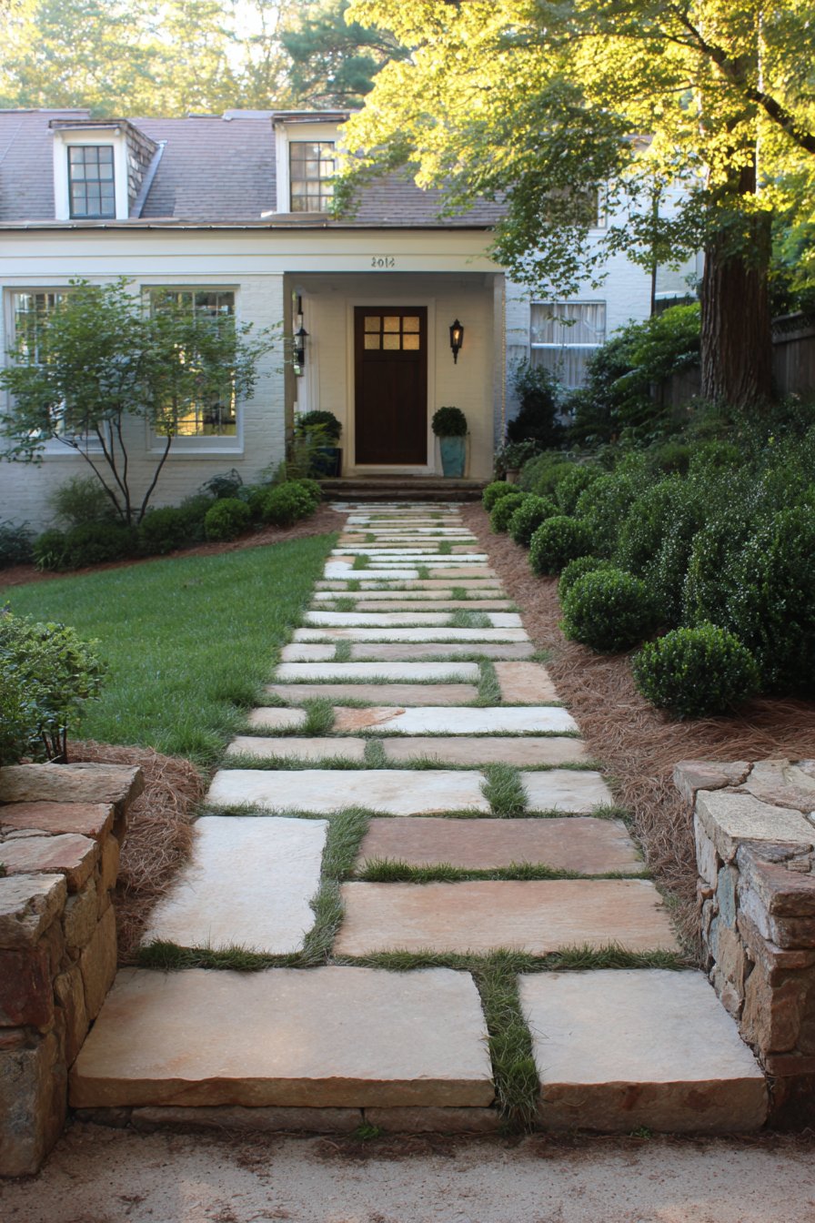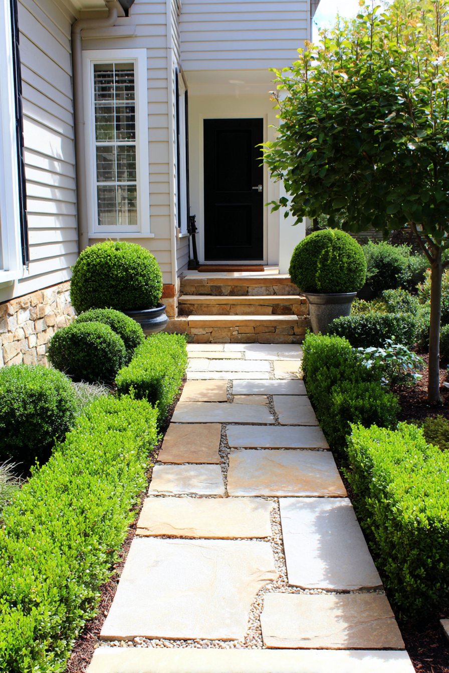 The warm hues of the flagstone pathway beautifully contrast with the lush green boxwood hedges, creating an inviting and structured aesthetic. To achieve this look, consider planting low-maintenance hedges alongside natural stone paths for a timeless garden design.