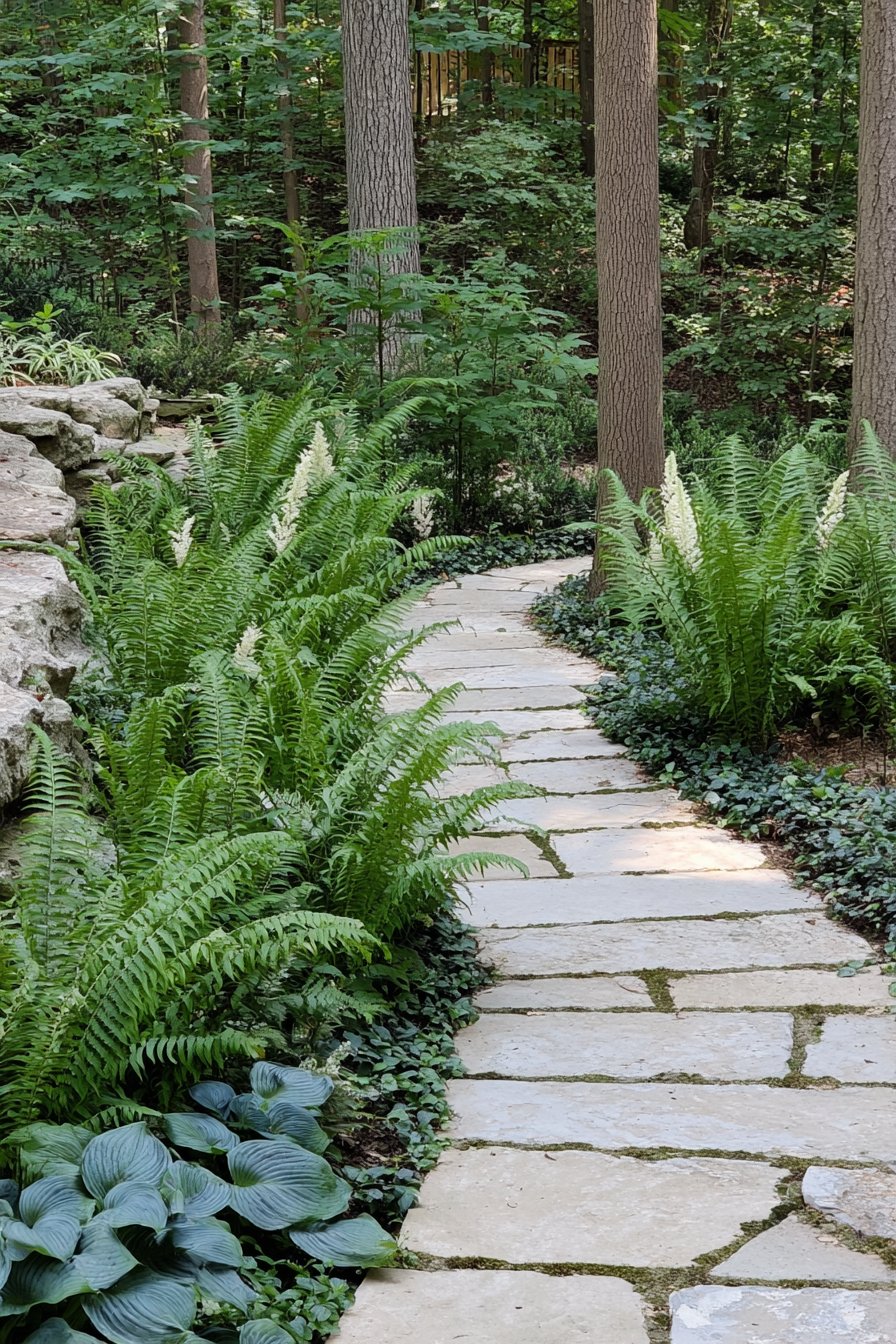 The serpentine flagstone pathway, with its warm earth tones, invites exploration while harmonizing beautifully with lush ferns and subtle ground cover. To replicate this serene look, incorporate varied textures in your plantings and ensure your path meanders naturally through the garden.