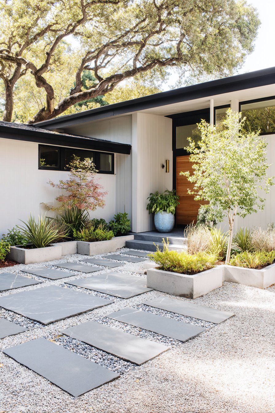 The sleek flagstone path, surrounded by crisp white gravel and vibrant green plants, creates a harmonious blend of modern elegance and natural beauty. Incorporate varied textures with concrete planters and colorful foliage to achieve a fresh, inviting atmosphere in your own garden space.