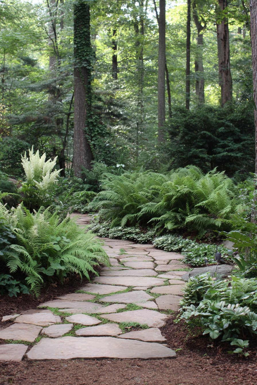 The curved flagstone path, framed by lush ferns and soft ground cover, creates a serene and inviting atmosphere in the garden. To achieve this look, use natural stone for pathways and incorporate like ferns and hostas for texture and greenery.