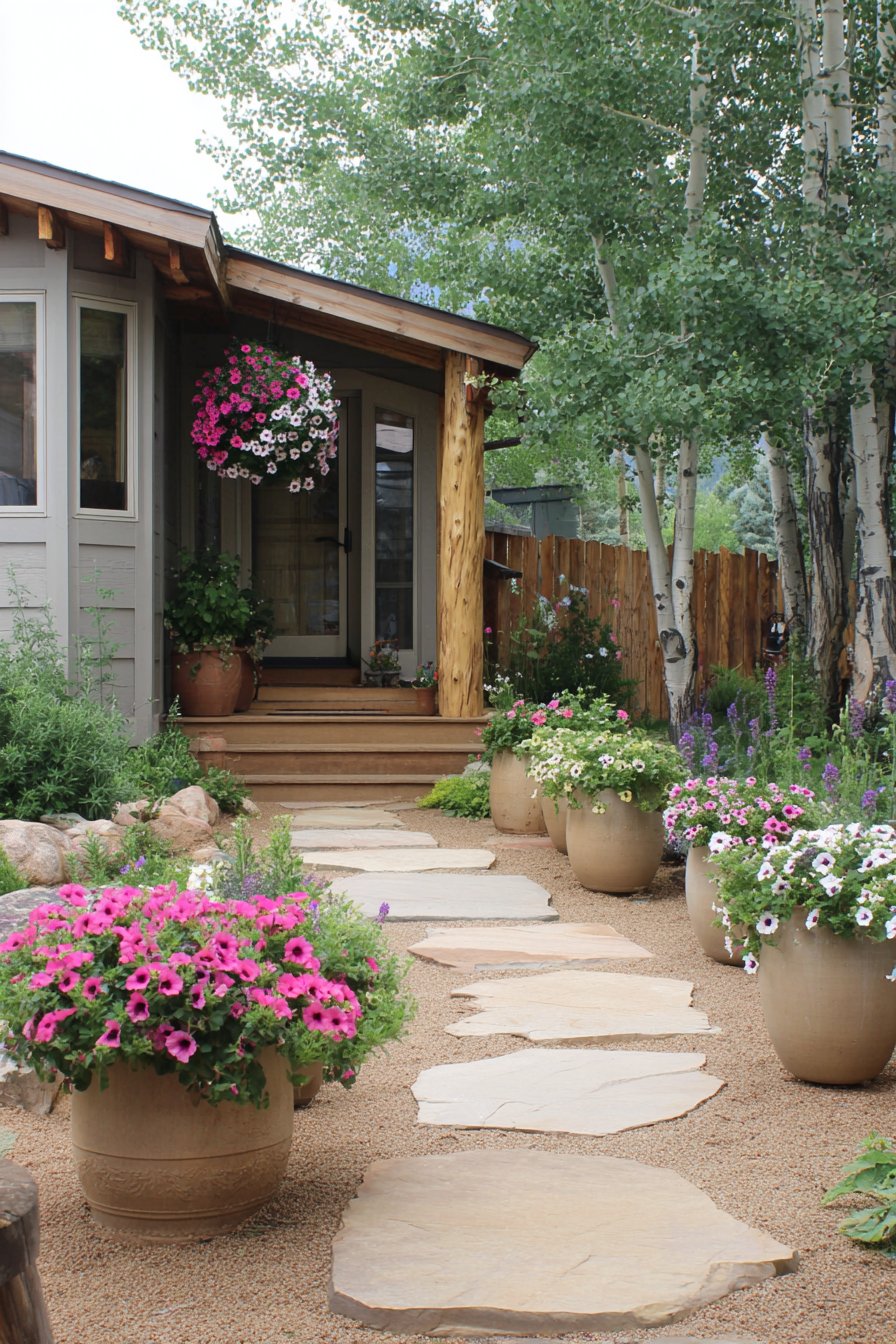 The natural flagstone pathway, adorned with vibrant petunias, creates a charming and inviting transition between spaces, blending earthy tones with lively colors. For a similar effect, consider using varying stone sizes and colorful planters filled with seasonal blooms to enhance visual interest and accessibility.