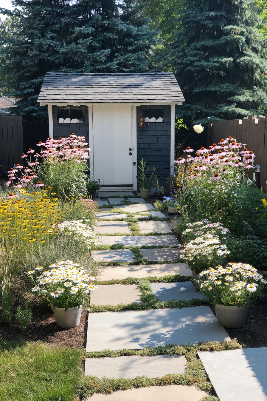 The warm hues of the flagstone path harmonize beautifully with the vibrant daisies and soft green foliage, creating a welcoming and serene atmosphere. To replicate this look, incorporate natural stone for pathways, intersperse with low-maintenance perennials, and add decorative lanterns for a charming evening glow.