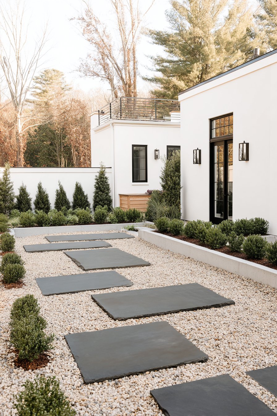 The striking slate flagstone pathway contrasts beautifully with the soft, light gravel, creating a modern yet inviting atmosphere. To achieve this look, incorporate low-maintenance evergreen plants alongside the path for a lush, structured feel.