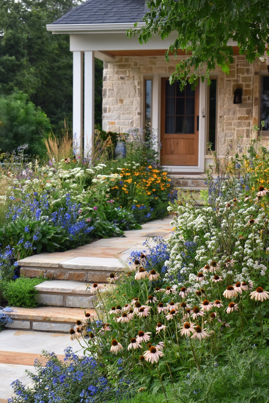 The warm hues of natural stone flagstone create a welcoming pathway, beautifully complemented by vibrant perennials like coneflowers and bluebells. To replicate this charm, opt for a mix of colorful blooms and varied textures, ensuring a layered planting scheme that draws the eye.