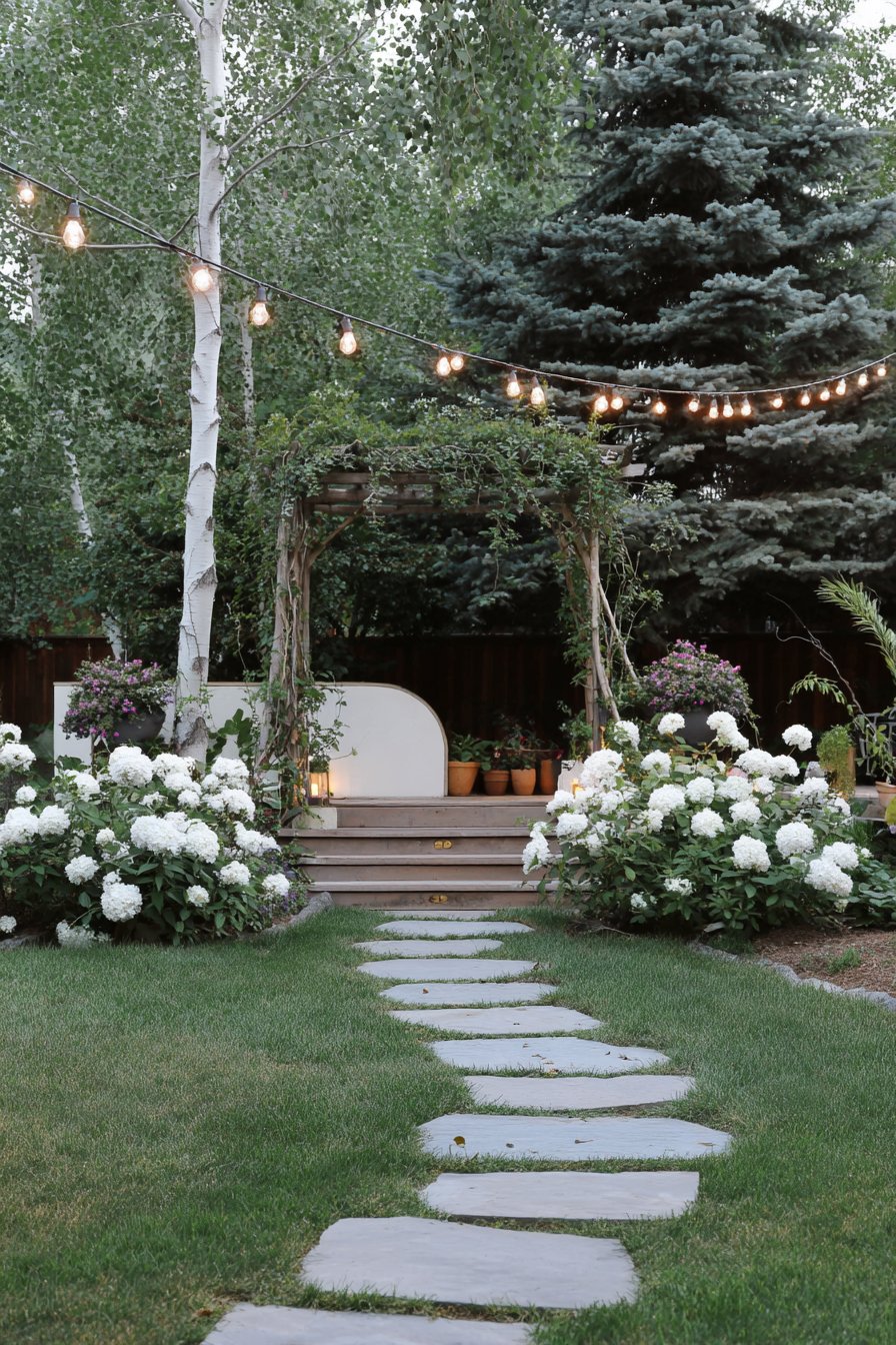 The elegant curved flagstone pathway, flanked by lush green grass and vibrant white hydrangeas, creates a serene and inviting atmosphere. To replicate this look, incorporate natural stones for pathways and choose flowering plants that complement the soft hues of your garden.