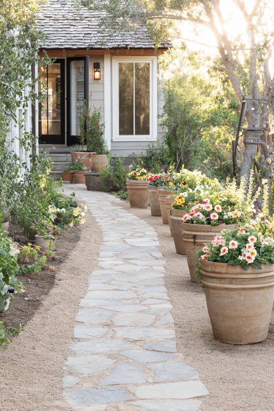 The curved flagstone pathway invites exploration while its warm hues harmonize beautifully with the vibrant planters, creating a welcoming atmosphere. To achieve this look, consider using natural stone for pathways and varied, colorful flowers in terracotta pots for a charming, cohesive design.