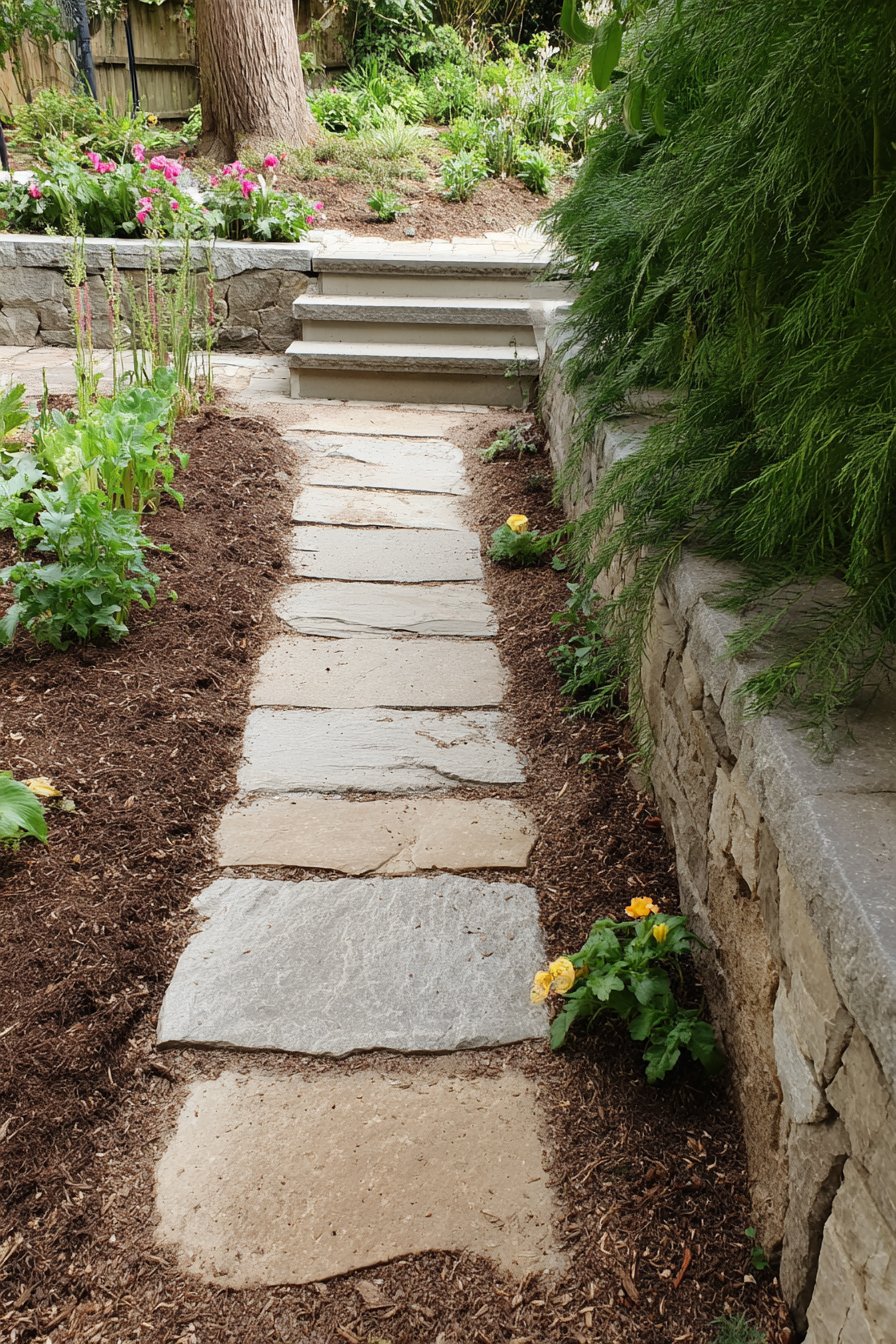 The warm hues of natural stone flagstones create a welcoming pathway, harmonizing beautifully with the lush greenery and vibrant flowers on either side. To replicate this look, consider using irregularly shaped stones and surrounding them with mulch or low-maintenance perennials for a rustic charm.