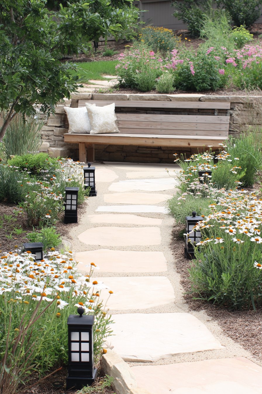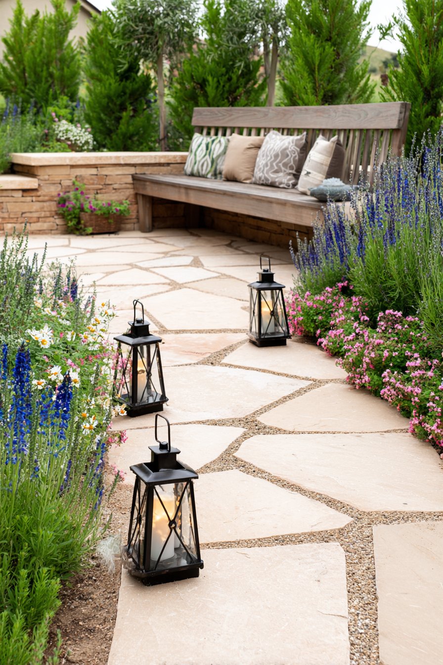 The warm hues of the flagstone path create a welcoming contrast against vibrant plantings of lavender and cheerful daisies, enhancing the garden’s charm. Incorporate lantern accents along pathways to add soft illumination, creating an inviting atmosphere for evening strolls.