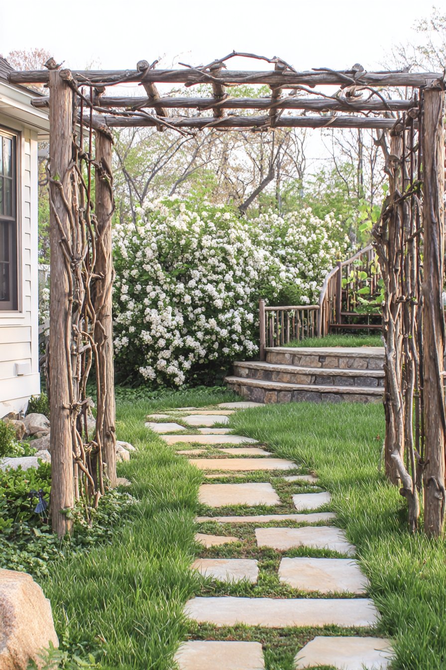 The harmonious blend of warm flagstone and lush grass infill creates a welcoming pathway that invites exploration and enhances the garden’s natural beauty. To replicate this look, use irregularly shaped stones and fill gaps with low-maintenance ground cover for a seamless, organic aesthetic.