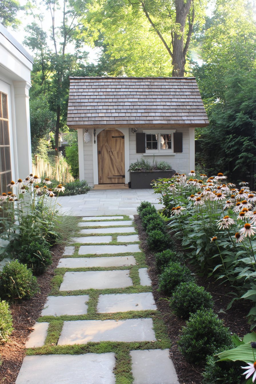 The natural flagstone pathway, framed by lush greens, creates a harmonious blend of earthy tones and textures that invite exploration. Incorporate and soft grasses alongside the stones for a seamless, organic look that enhances your garden’s charm.