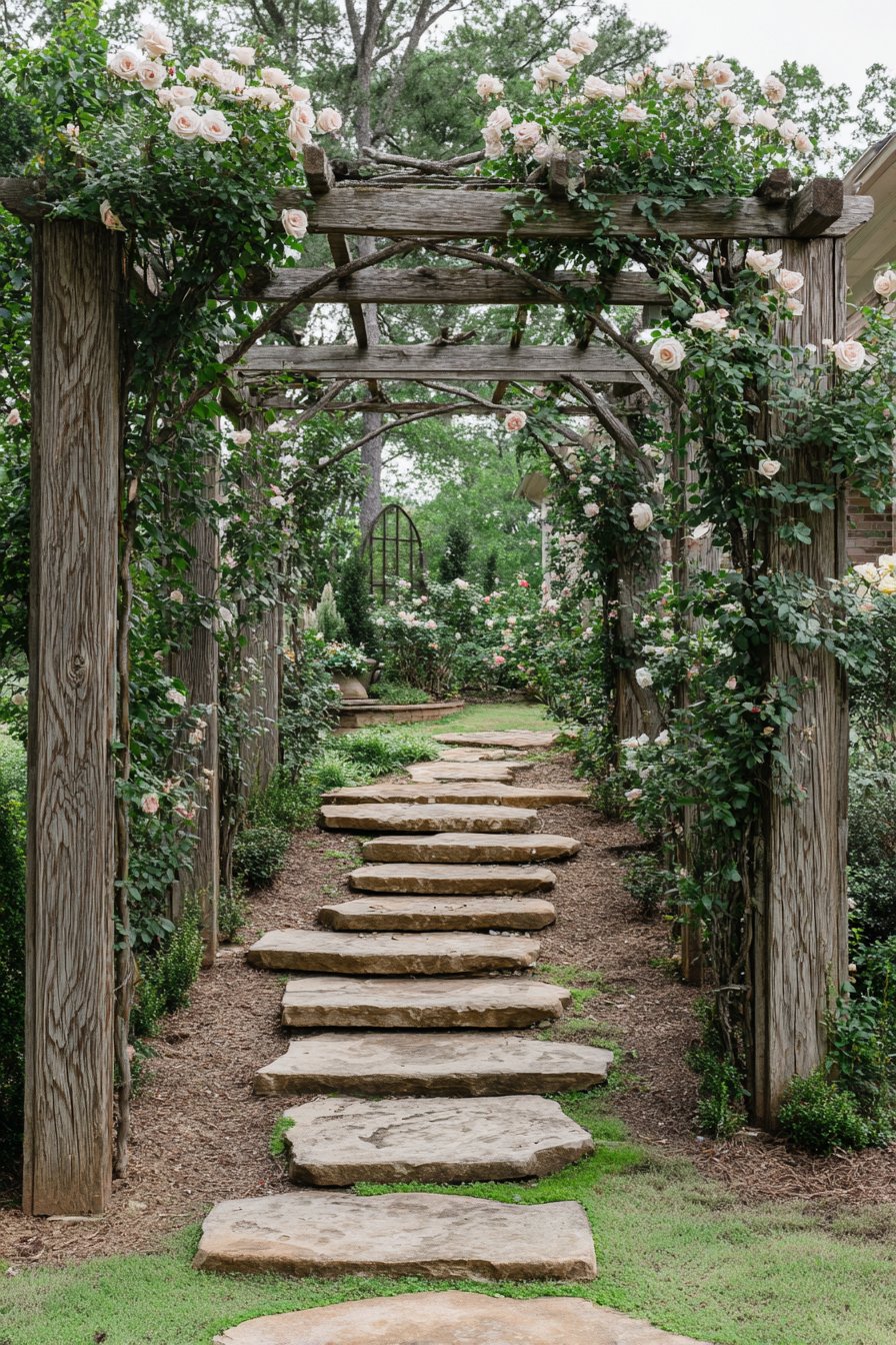 The rustic flagstone pathway, bordered by delicate and lush greenery, creates a charming and inviting atmosphere, perfect for leisurely strolls. To achieve this look, incorporate natural stone pavers and plant climbing roses alongside wooden trellises for a romantic touch.