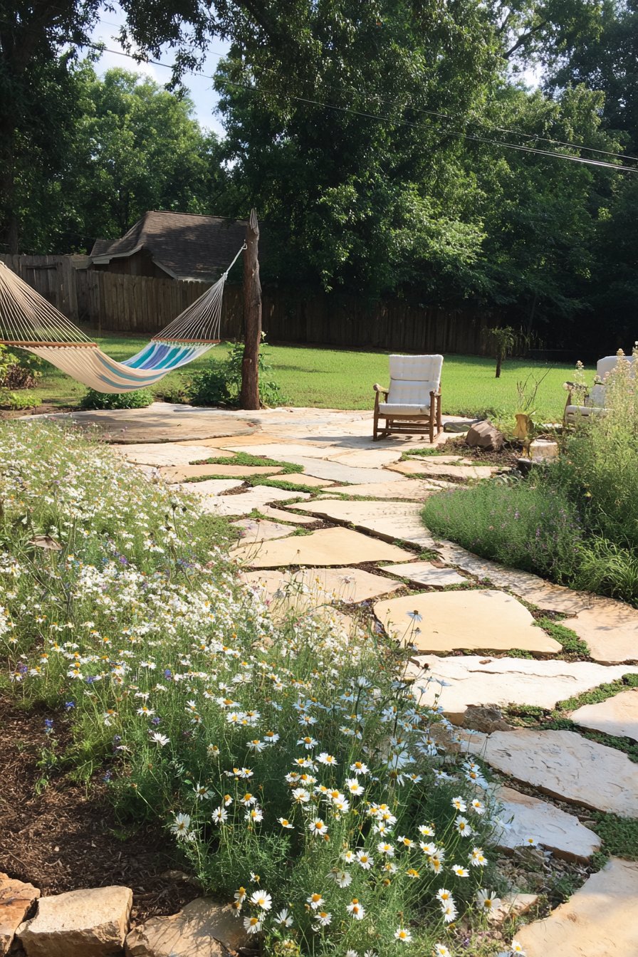 The warm hues of the natural flagstone pathway beautifully contrast with the cheerful white and yellow daisies, creating a vibrant and inviting atmosphere. To replicate this look, consider incorporating similar stones and low-maintenance flowering plants to enhance your garden’s charm and accessibility.