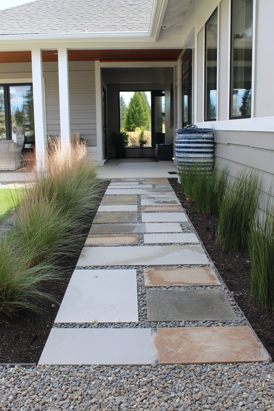The harmonious blend of flagstone and gravel creates a visually appealing path, enhanced by the earthy tones of the stones and the soft textures of ornamental grasses. To replicate this look, use varied-sized stones for interest and plant low-maintenance grasses along the edges for a natural, inviting feel.