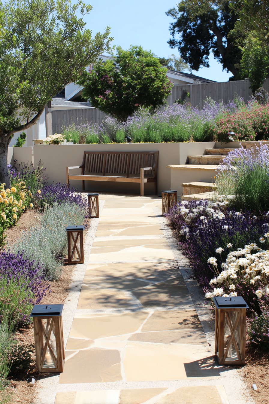 The natural stone flagstone pathway elegantly complements lush lavender and vibrant yellow blooms, creating a harmonious blend of colors and textures. To achieve a similar look, incorporate diverse plantings alongside durable pathways, and consider soft lighting for enchanting evening ambiance.
