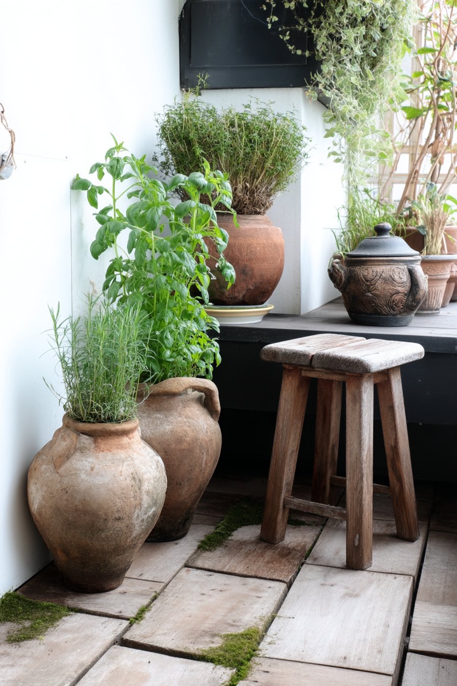 This charming garden features earthenware pots filled with aromatic herbs like basil, rosemary, and thyme, enhancing both beauty and functionality. To replicate this rustic look, use aged terracotta containers and arrange them on a simple wooden surface for an inviting atmosphere.