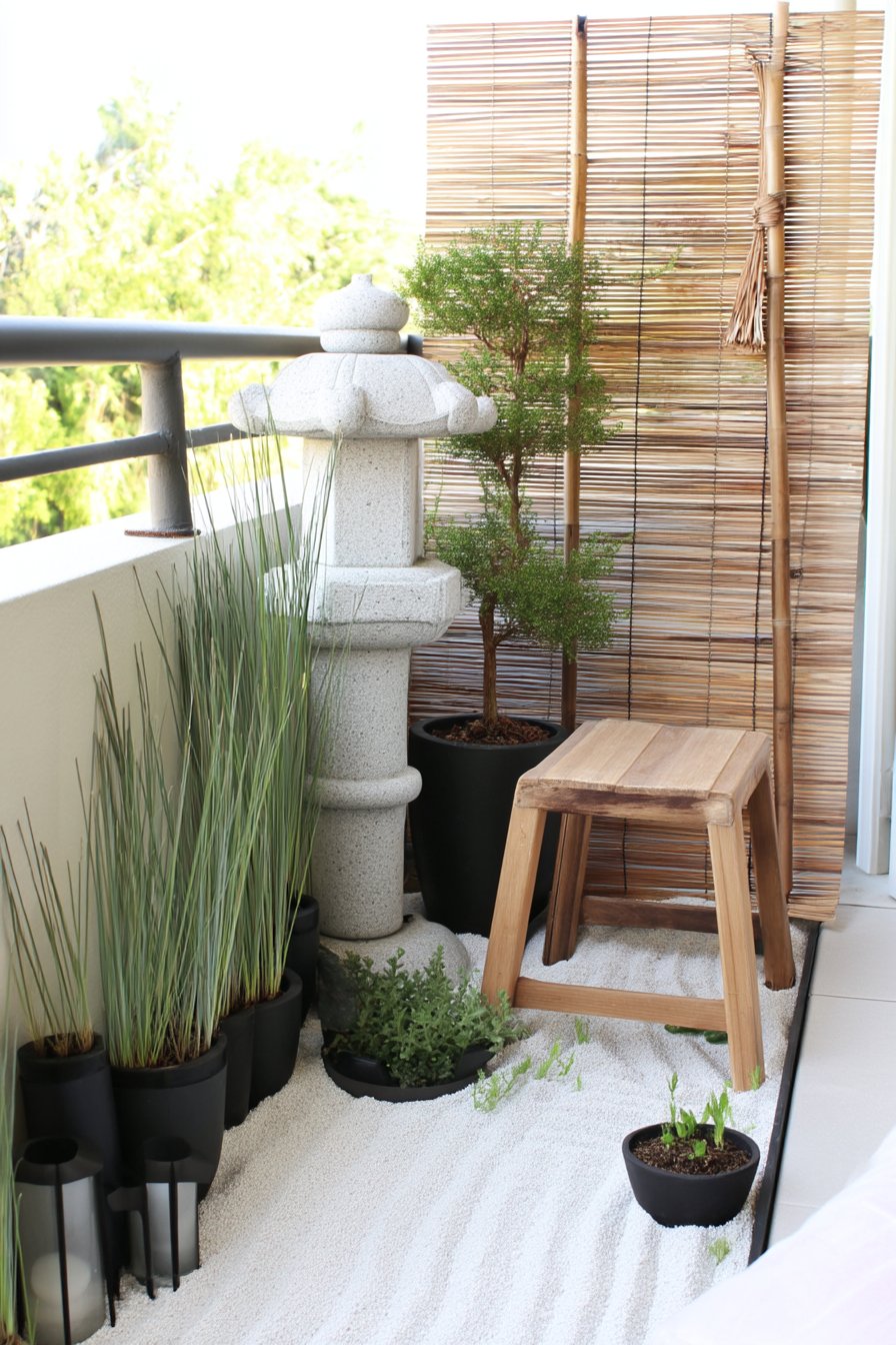 This serene balcony garden features elegant bamboo screening and a calming stone lantern, creating a peaceful retreat. Incorporate low-maintenance plants like ornamental grasses and succulents for a minimalist yet lush aesthetic.
