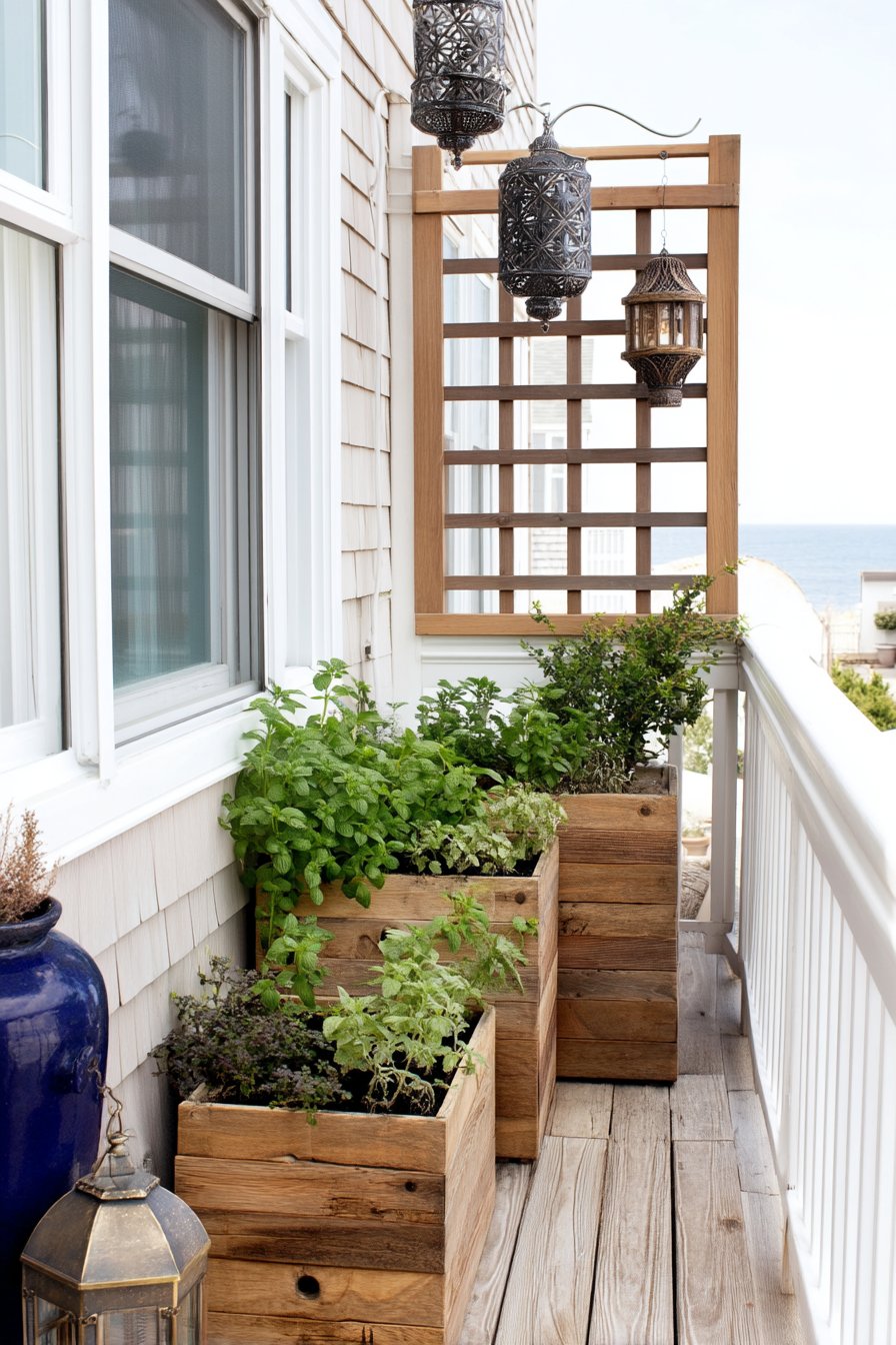 This coastal herb balcony design features lush green herbs like mint and oregano in rustic wooden planters, creating a refreshing and aromatic retreat. Incorporate decorative lanterns and a trellis for added charm, while ensuring your herbs receive plenty of sunlight and regular watering.