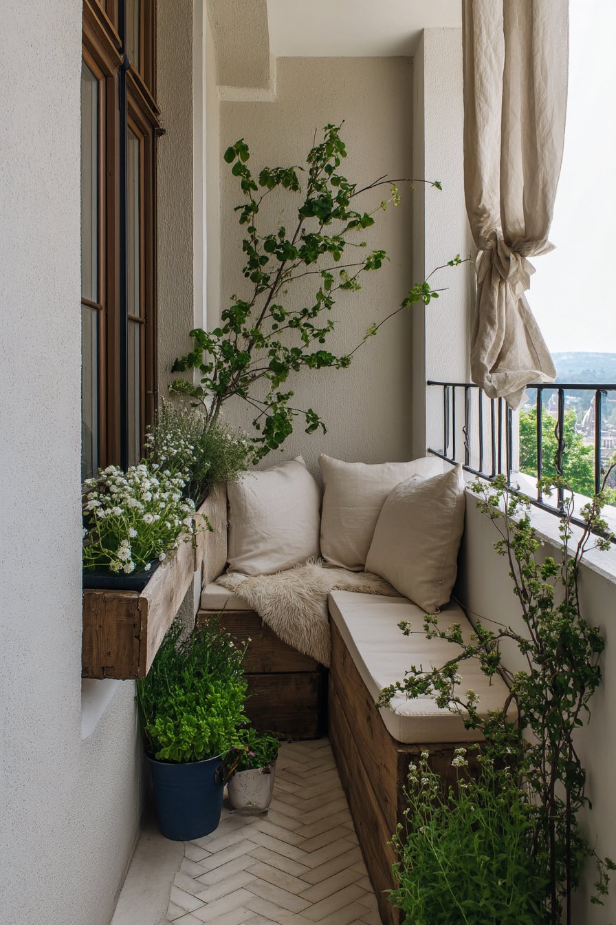 This serene balcony design features lush greenery, including trailing vines and fragrant herbs, creating a tranquil retreat. To replicate this look, consider incorporating low-maintenance plants in rustic containers and adding soft cushions for comfort.