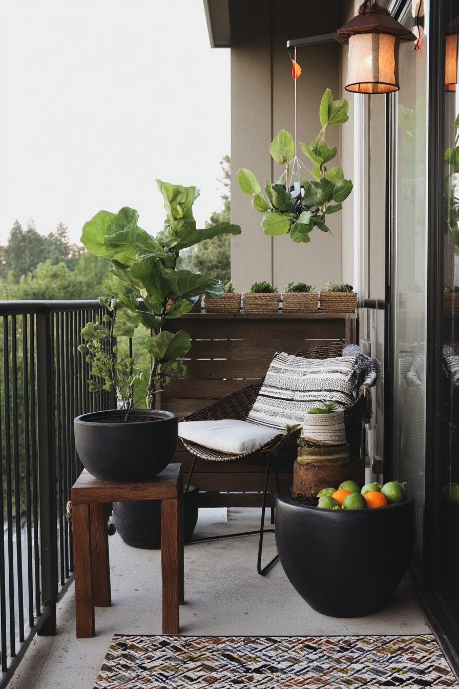 This minimalist balcony garden features lush fiddle leaf figs and charming succulents, creating a vibrant yet serene atmosphere. To replicate this look, use a mix of varied plant heights and incorporate natural materials like wood and woven textures for warmth.