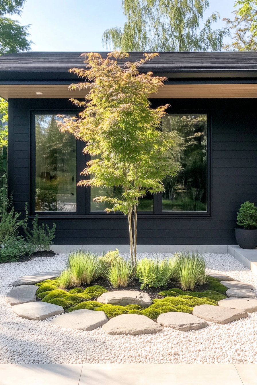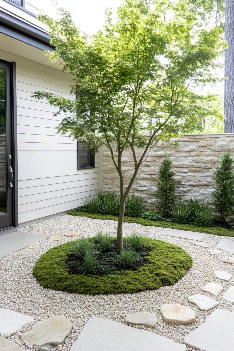 This minimalist features a stunning tree surrounded by lush green moss and low-maintenance ornamental grasses, creating a serene oasis. To replicate this look, use gravel pathways and strategic plantings to enhance visual interest while ensuring easy upkeep.