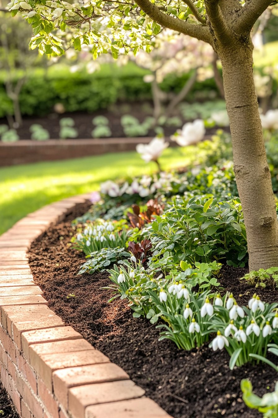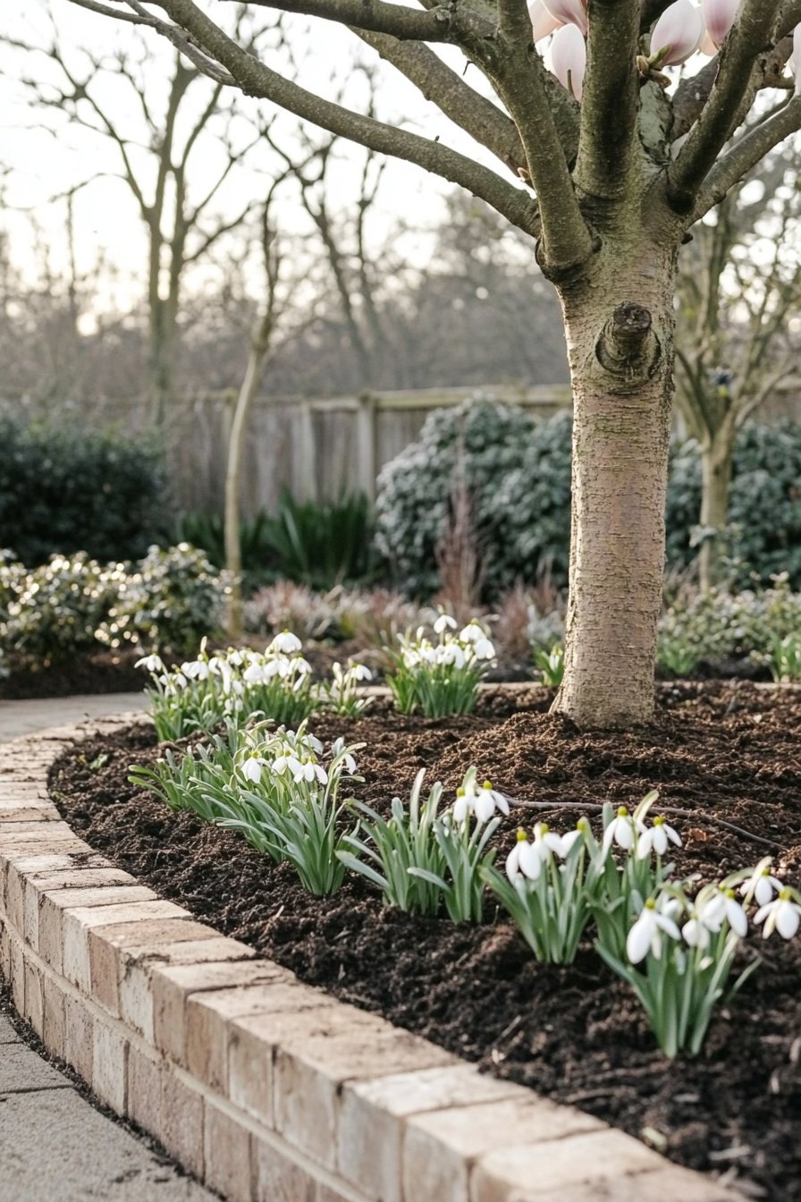 The delicate white snowdrops create a stunning contrast against the rich, dark soil, beautifully framing the tree base and inviting early spring blooms. For a similar effect, plant snowdrops in well-drained soil and consider using a low brick border to enhance visual appeal.