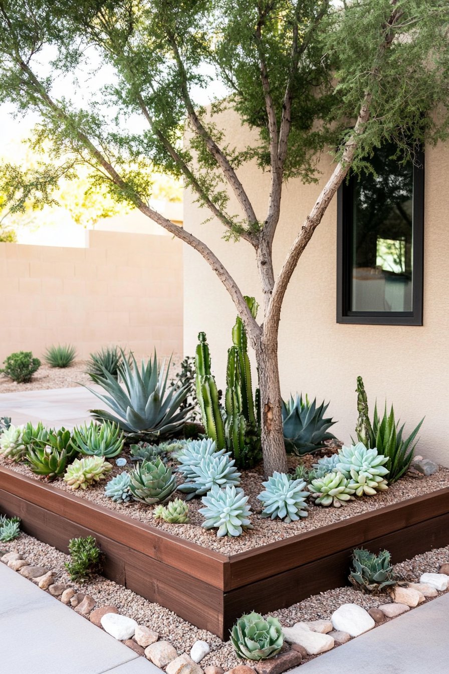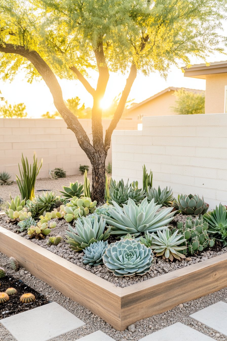 This design beautifully combines various succulent species, showcasing a harmonious palette of greens and blues that thrive under the dappled shade of a tree. To replicate this look, consider using a mix of agaves, echeverias, and cacti in a well-draining soil, framed by rustic wooden borders for added warmth.