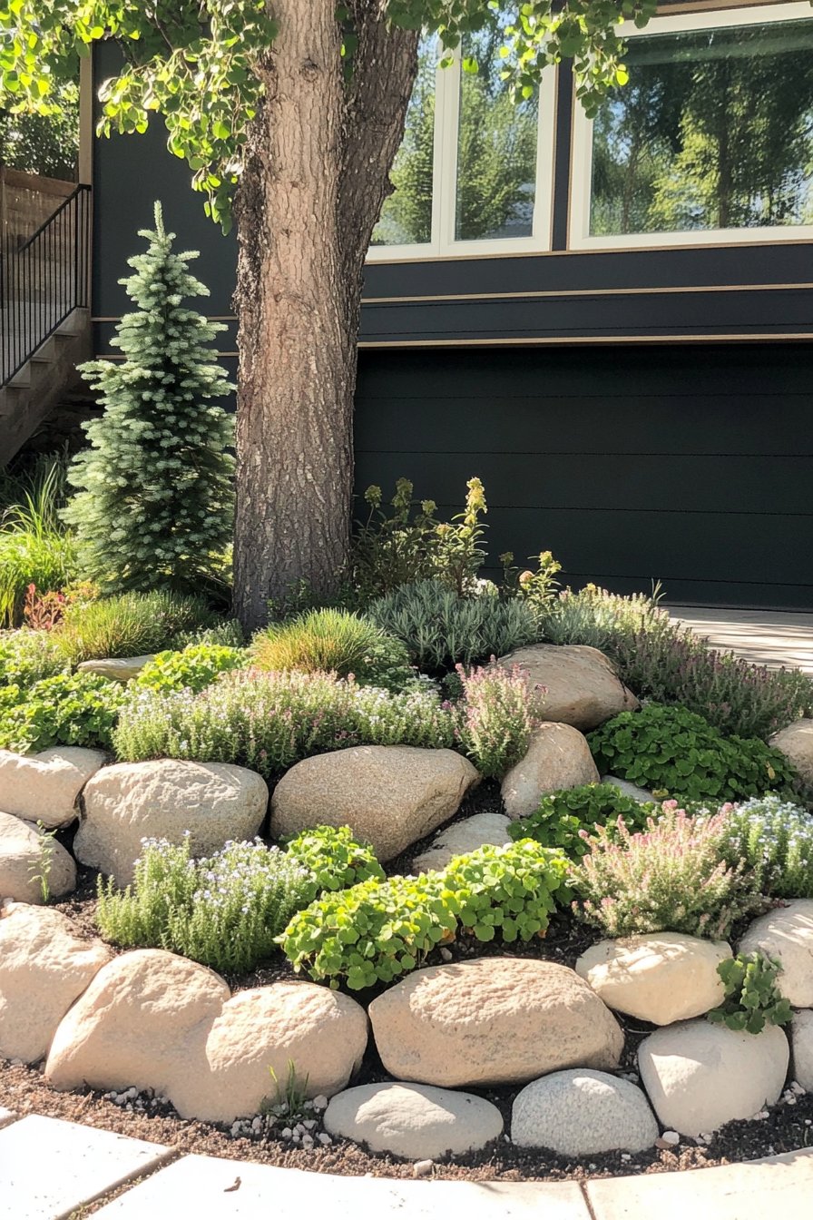 This design beautifully combines the rugged texture of large boulders with lush perennial groundcovers like creeping thyme and clover, creating a serene, low-maintenance landscape. To replicate this look, incorporate a variety of and arrange stones in natural clusters for a harmonious feel.