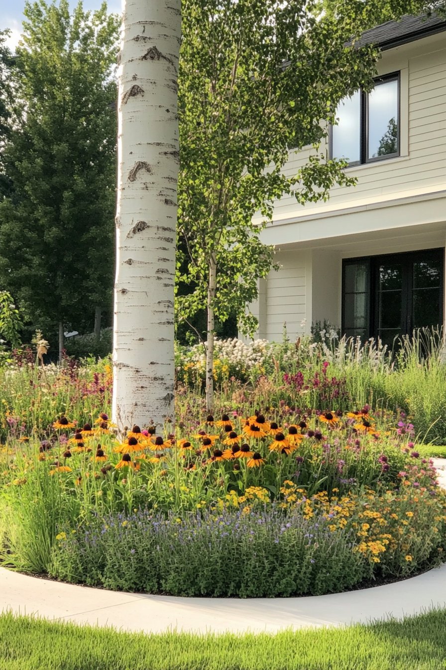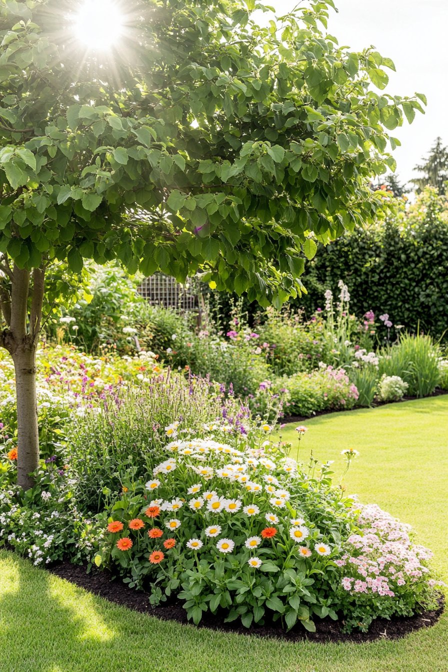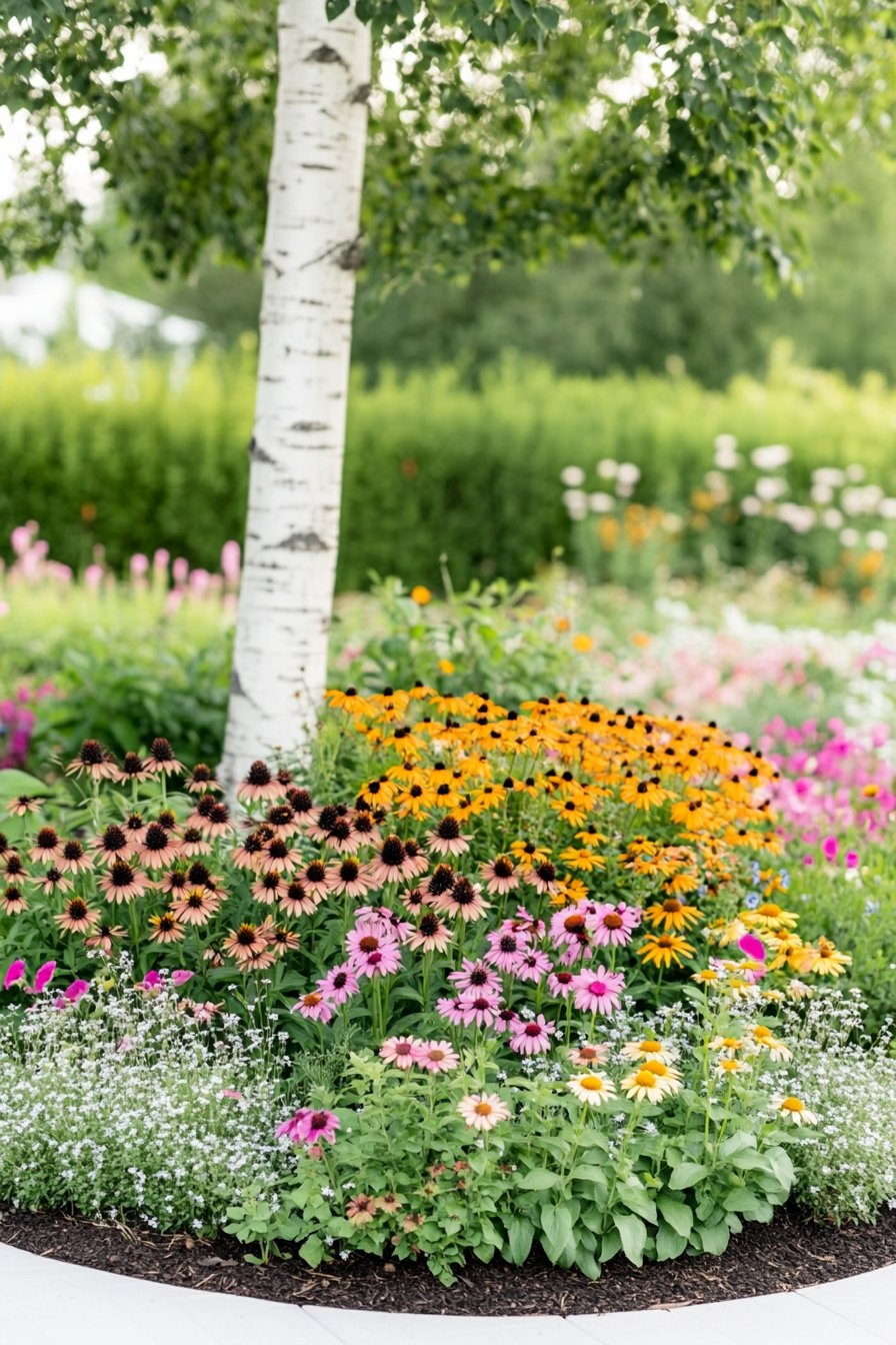 A vibrant mix of coneflowers and black-eyed Susans creates a stunning color palette around the tree, attracting pollinators and enhancing biodiversity. For a similar effect, layer perennials with varying heights and incorporate ground cover like alyssum for added texture and interest.