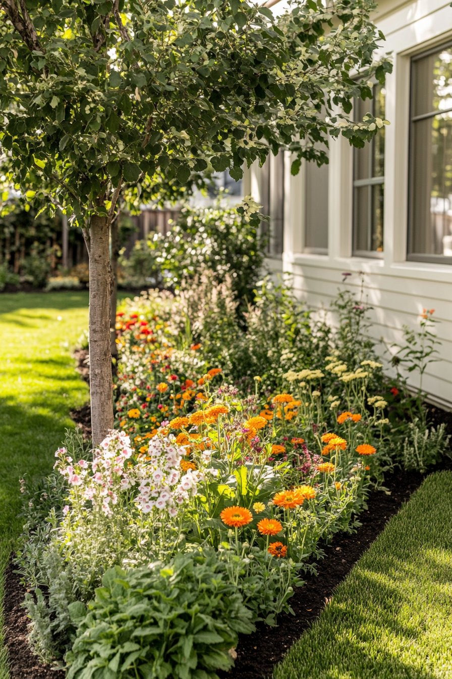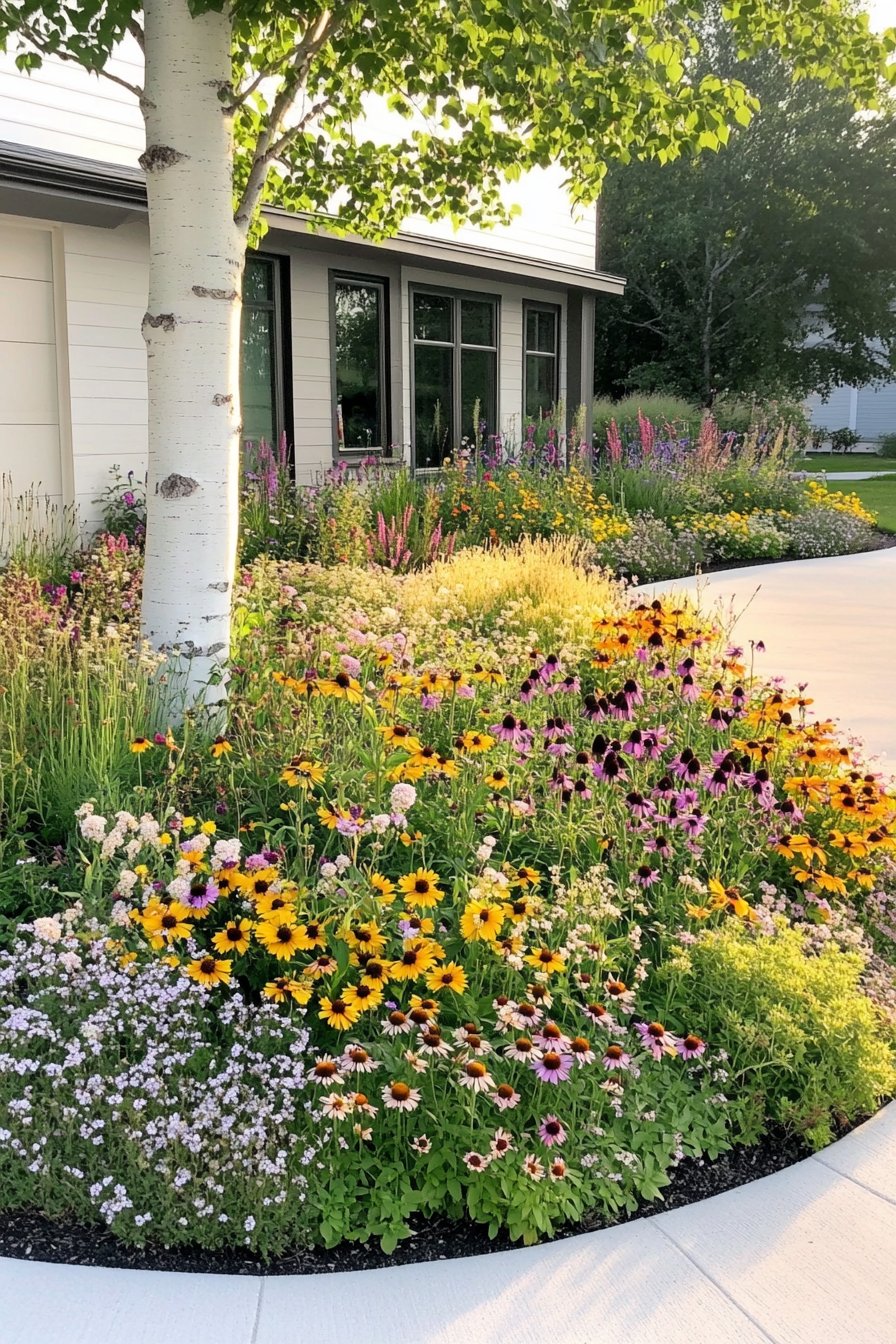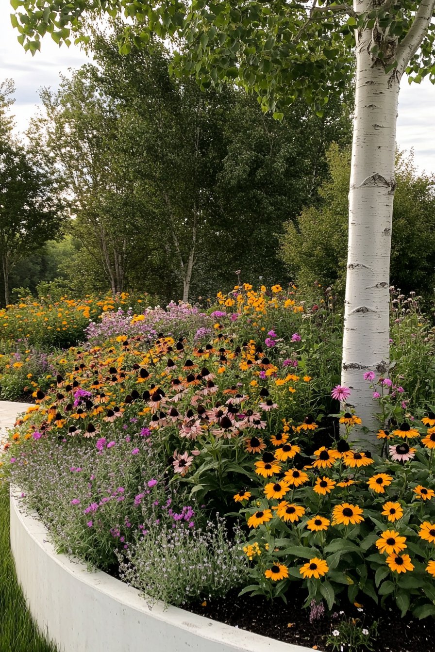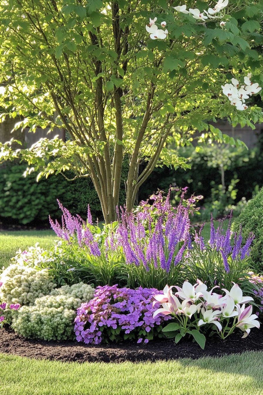 A vibrant mix of coneflowers and black-eyed Susans creates a stunning color palette around the tree, attracting pollinators and enhancing biodiversity. For a similar effect, layer perennials with varying heights and incorporate ground cover like alyssum for added texture and interest.