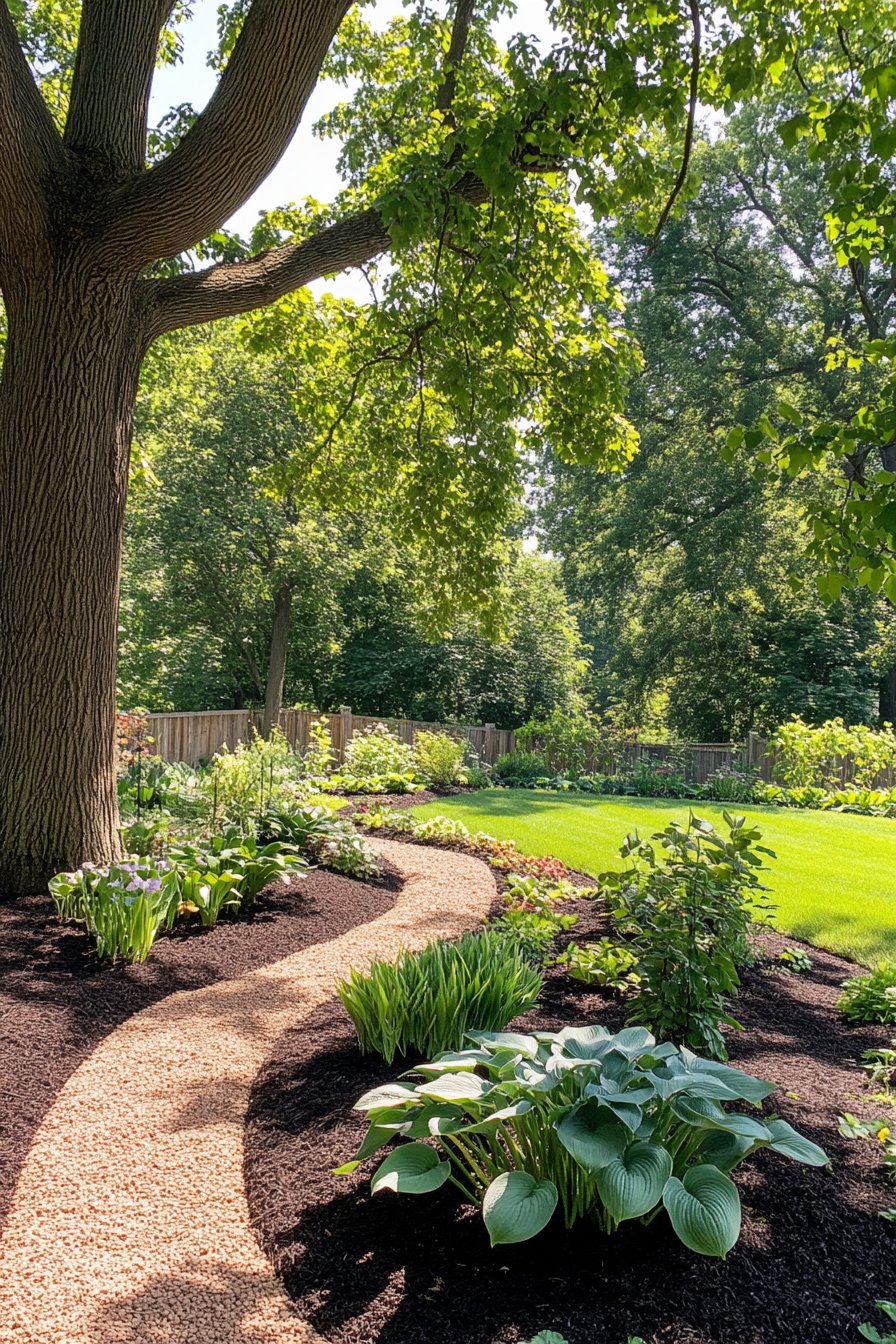 The gentle curves of the pathway invite exploration, framed beautifully by lush hostas and vibrant perennials for a serene, layered effect. To replicate this look, use rich mulch for contrast and select shade-tolerant plants that thrive under tree canopies.