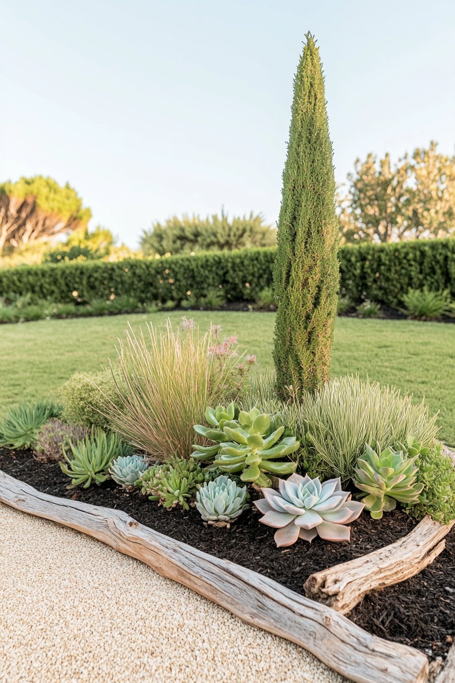 This design beautifully combines the sleek lines of cypress with the diverse textures of various succulents, creating a modern yet inviting atmosphere. To replicate this look, use a mix of hardy succulents and ornamental grasses, and consider adding natural elements like driftwood for added interest.