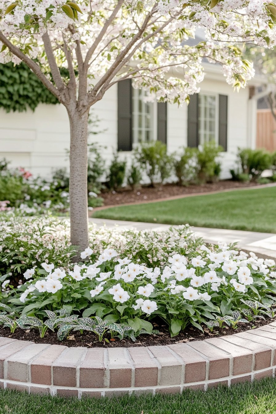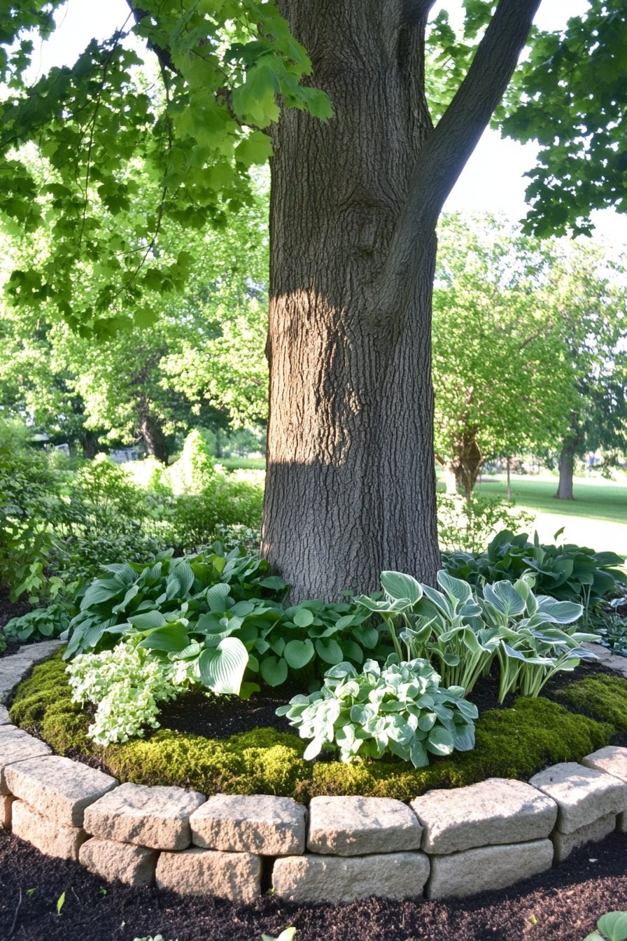 Rich shades of green from hostas and delicate white blooms create a tranquil oasis around a majestic tree, enhancing the natural beauty of the space. To replicate this serene look, consider using a stone border and incorporating a variety of shade-tolerant plants for texture and depth.
