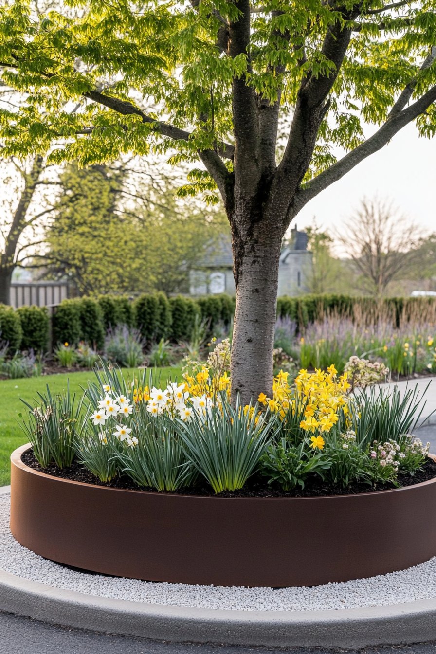 This design beautifully combines vibrant yellow and white daffodils with lush green grasses, creating a striking contrast that draws the eye. For a similar effect, plant daffodils in a circular arrangement around a central tree, using a clean, modern planter for added elegance.